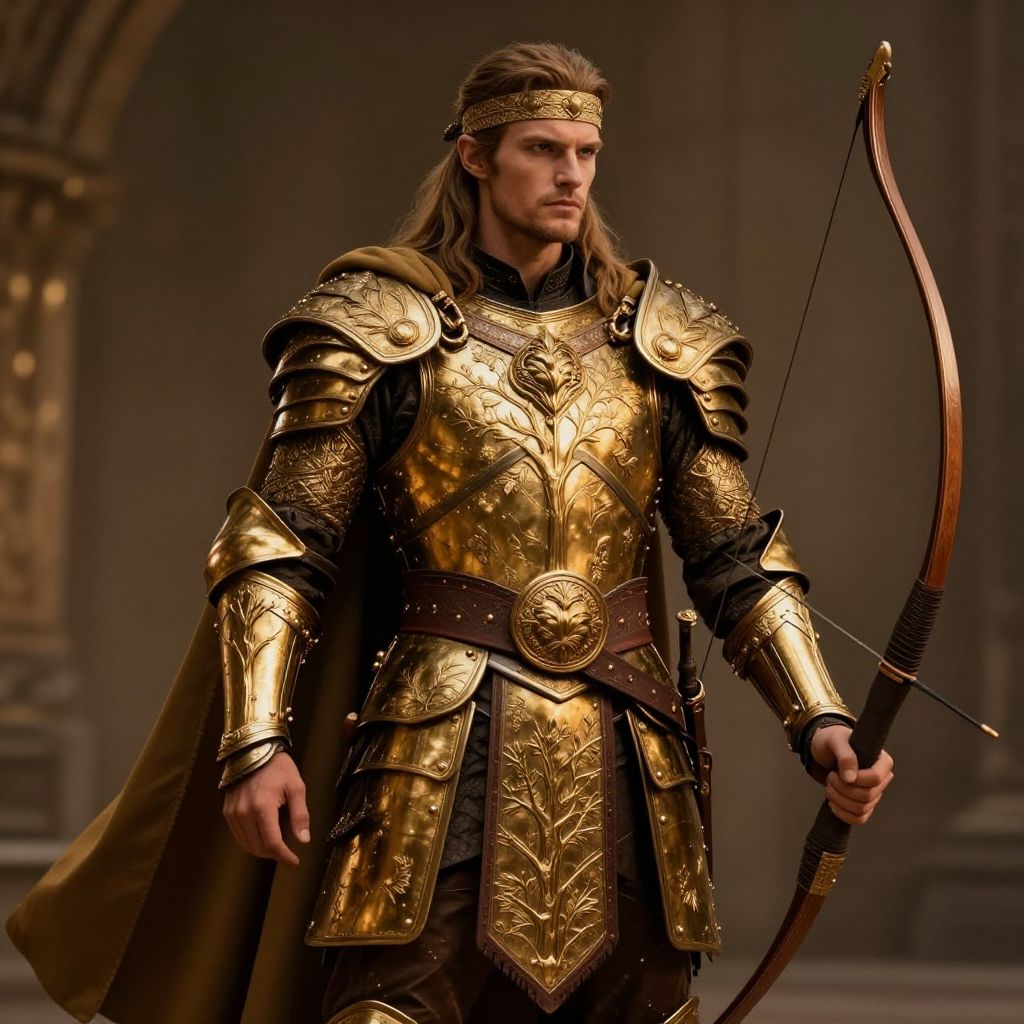 Photograph of a tall, muscular man with long, blonde hair and a beard, wearing elaborate, golden medieval armor with intricate patterns. He holds a sleek, wooden bow in his right hand. The armor includes a headband, shoulder guards, chest plate, and a flowing cape. The background is a dimly lit, stone archway, adding a medieval, regal atmosphere. The man's serious expression and poised stance convey strength and readiness. The image has a cinematic quality, reminiscent of fantasy or historical epic films.