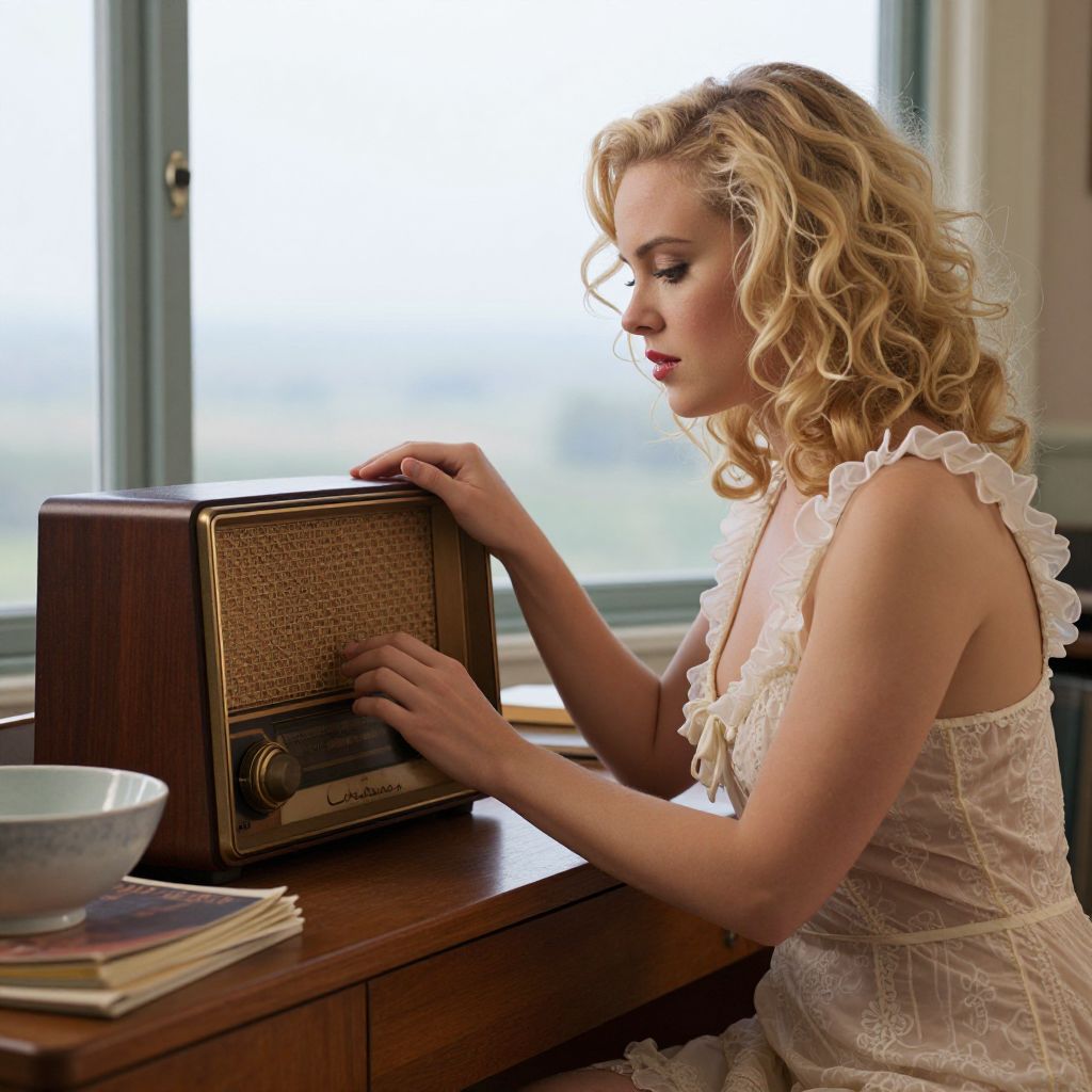 In this photorealistic and highly detailed image, a modern, fashionable blonde woman with curly hair is depicted in a frilly, flimsy nightgown, reminiscent of Stevie Nicks, Natalie Portman, and Faith Hill. She is seated facing a vintage ham shortwave Collins radio, operating it with a serious yet glamorous demeanor. The radio, an old-fashioned piece of technology, is placed on a wooden surface, possibly a table or desk, and is surrounded by various objects, including a bowl and a stack of books or magazines. The background features a window with a view of a serene landscape, adding to the serene and contemplative atmosphere of the scene. The overall composition is meticulously arranged, with the woman and the radio as the central focus, while the surrounding objects create a harmonious balance. The interplay of colors, textures, and shapes enhances the visual richness and structural composition of the image, capturing a moment of quiet reflection and nostalgia.