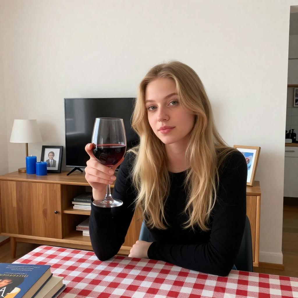 Young woman with long blonde hair, black long-sleeve shirt, holding a glass of red wine, sitting at a table with a red-and-white checkered tablecloth. Wooden cabinet, flat-screen TV, lamp, blue candles, framed pictures, and books on the table. Casual, relaxed setting.