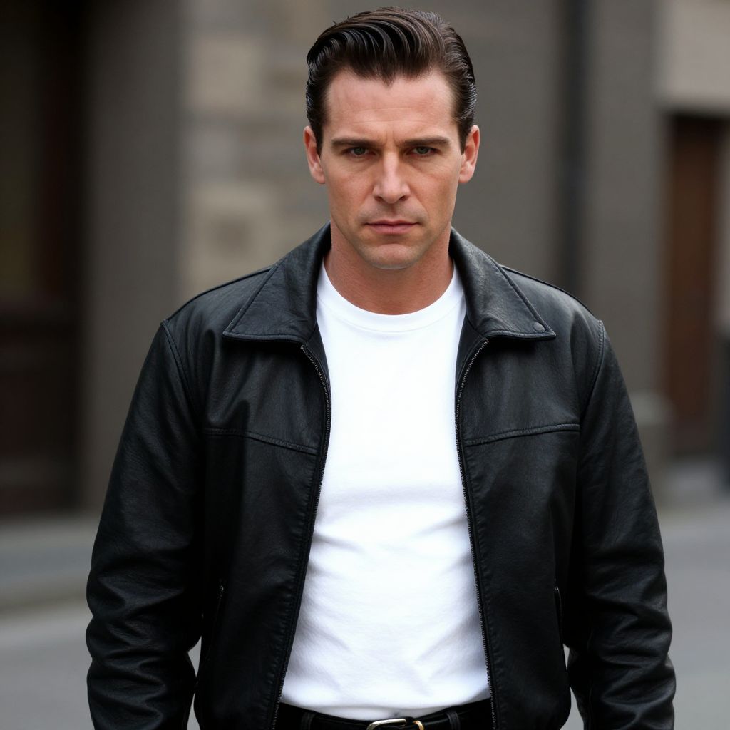 A man dressed in a classic Grease-inspired outfit stands confidently outdoors, wearing a sleek black leather jacket over a plain white t-shirt. His slicked-back hairstyle and intense gaze give off a vintage, rebellious vibe reminiscent of 1950s rock and roll culture.