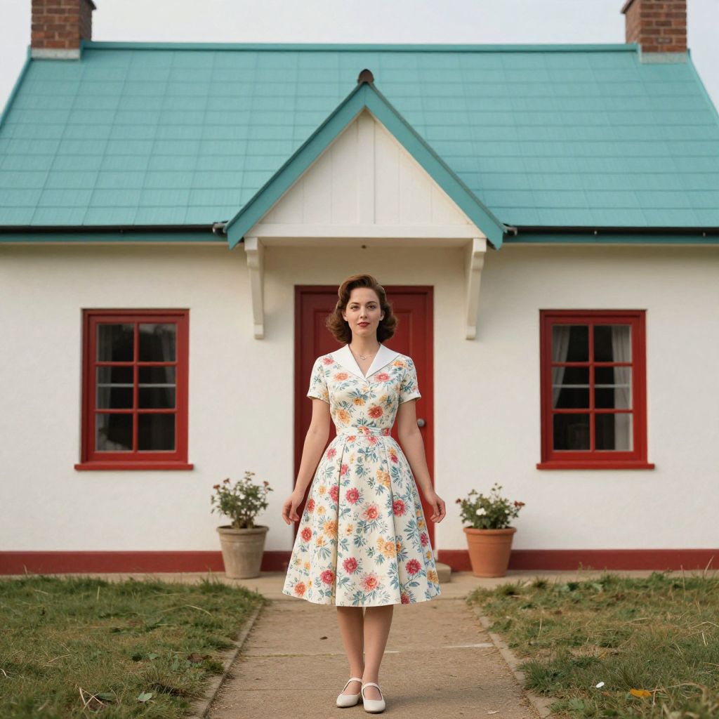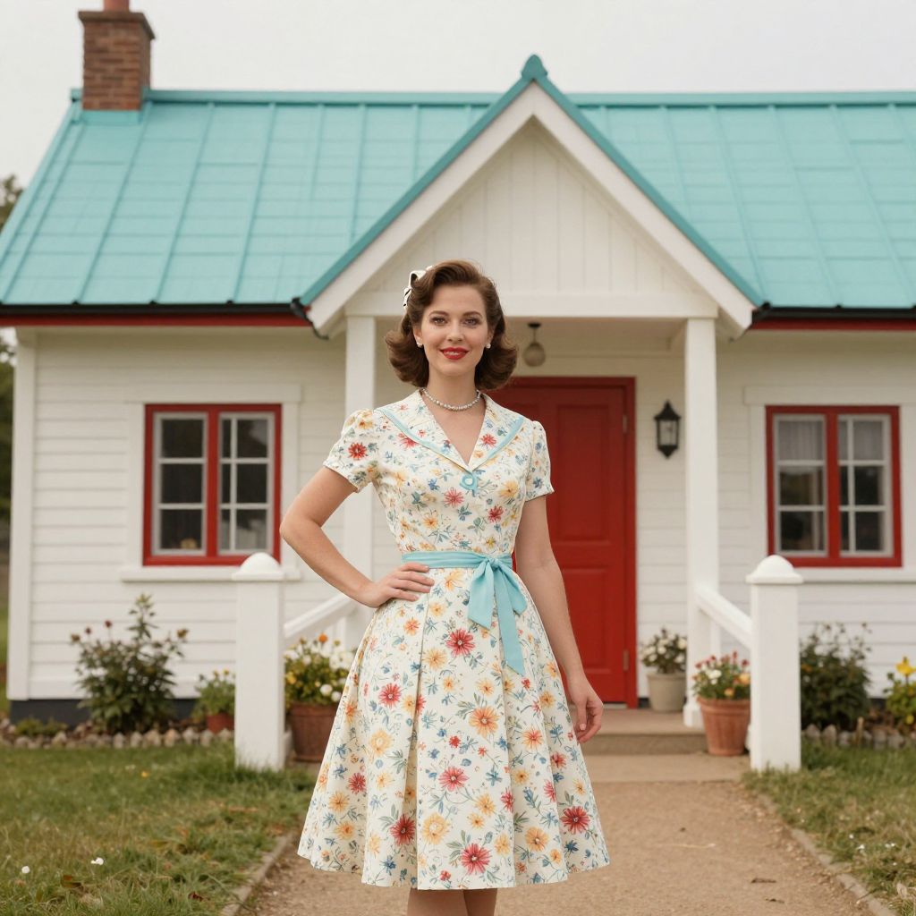 A vintage-inspired photograph captures a woman in a retro 1950s-style floral dress standing gracefully in front of a charming cottage with a teal roof and red door, evoking a nostalgic, high-definition rural aesthetic.