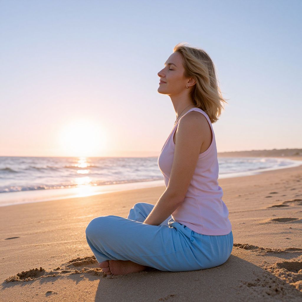 A photograph of a blonde woman sitting cross-legged on a sandy beach, facing the ocean. She's wearing a light pink sleeveless top and light blue pants. Her eyes are closed, and she's smiling softly, with the sun setting in the background. The sand is golden, and the sky is a gradient of soft blues and pinks.