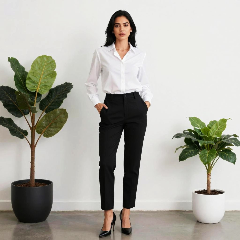 Photograph of a confident woman standing against a plain white background. She has long, wavy dark brown hair and is wearing a black suit with a white dress shirt and a navy blue and white striped tie. Her hands are in her pants pockets, and she is wearing black leather loafers. The suit is tailored, and she has a serious, composed expression. The lighting is bright and even, highlighting her stylish, professional attire. The floor is a light gray concrete, adding a minimalist, modern touch to the overall image.