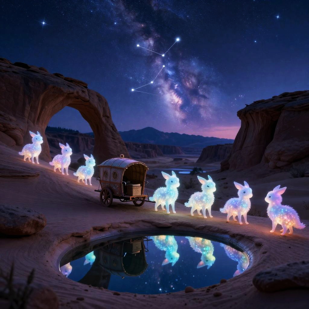 Digital artwork: Glowing, fluffy creatures surround a whimsical, illuminated caravan under a starry night sky, with constellations and arched rock