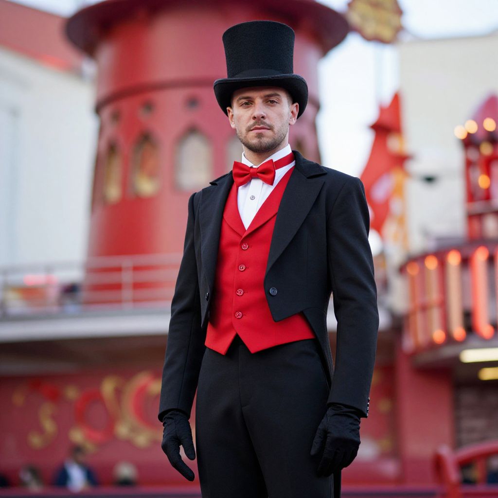 A man in a striking red and gold outfit stands confidently on a bustling sidewalk, wearing a tall red hat adorned with a prominent red feather at the top, a black belt around his waist, and black and red boots with bold red and black accents. His attire exudes elegance and boldness, with a slightly regal demeanor. He has a strong, defined facial structure, sharp features, and warm, attentive eyes that convey both strength and charm. The scene is set in a vibrant urban environment with tall buildings lining the street and lush green trees in the background, creating a dynamic contrast between the man's vibrant clothing and the natural, structured surroundings. Soft sunlight filters through the trees, casting gentle shadows and adding depth to the scene.