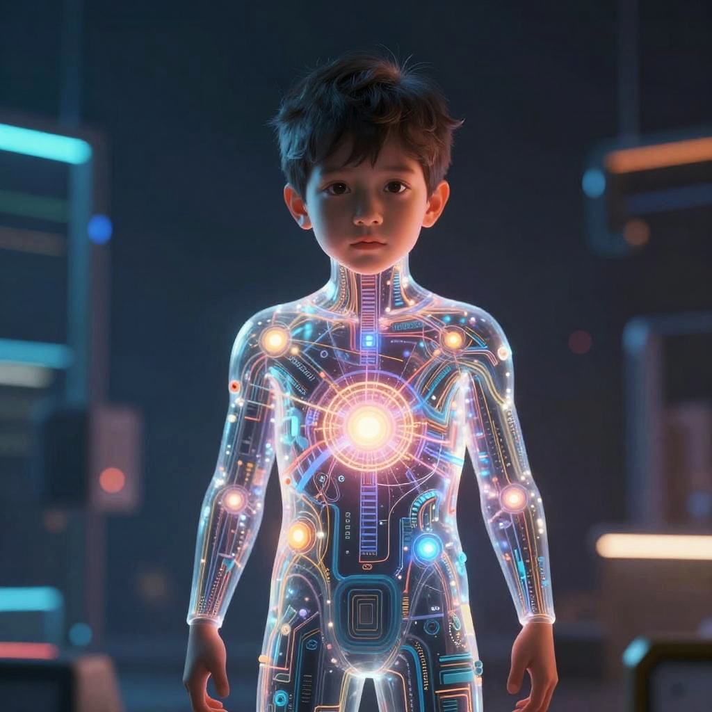 AI boy generator, imaginative depiction of a boy built from abstract AI data structures and neural networks, semi-transparent form with pulsing light cores inside, futuristic artistic interpretation, set in a digital dreamscape environment, vivid colors