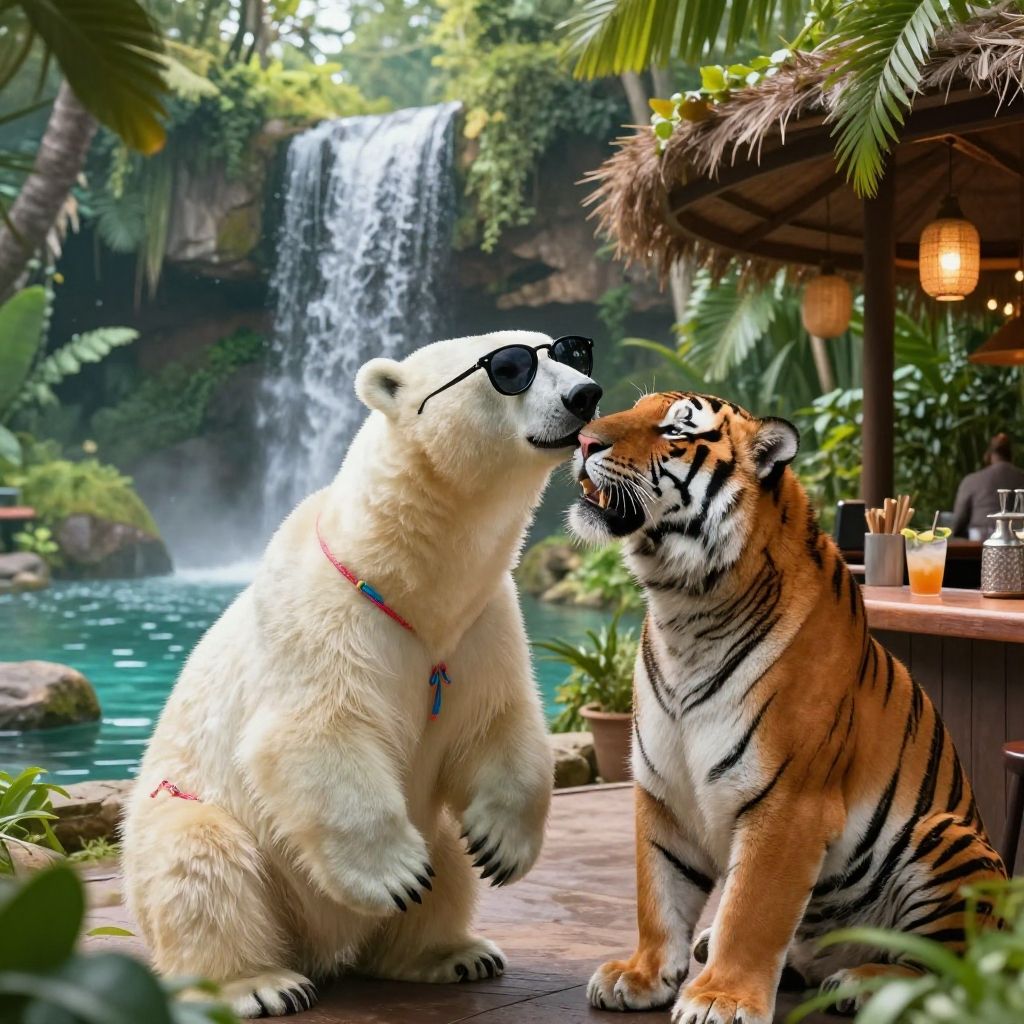 (photorrealistic), (love scene shot), animal on vacation, A tiger dressed in pijama nuzzle his nose with a (polar bear) in a hotel room (at a hotel), approaching perfection, highly detailed, digital painting, artstation, concept art, smooth, sharp focus, vibrant colors