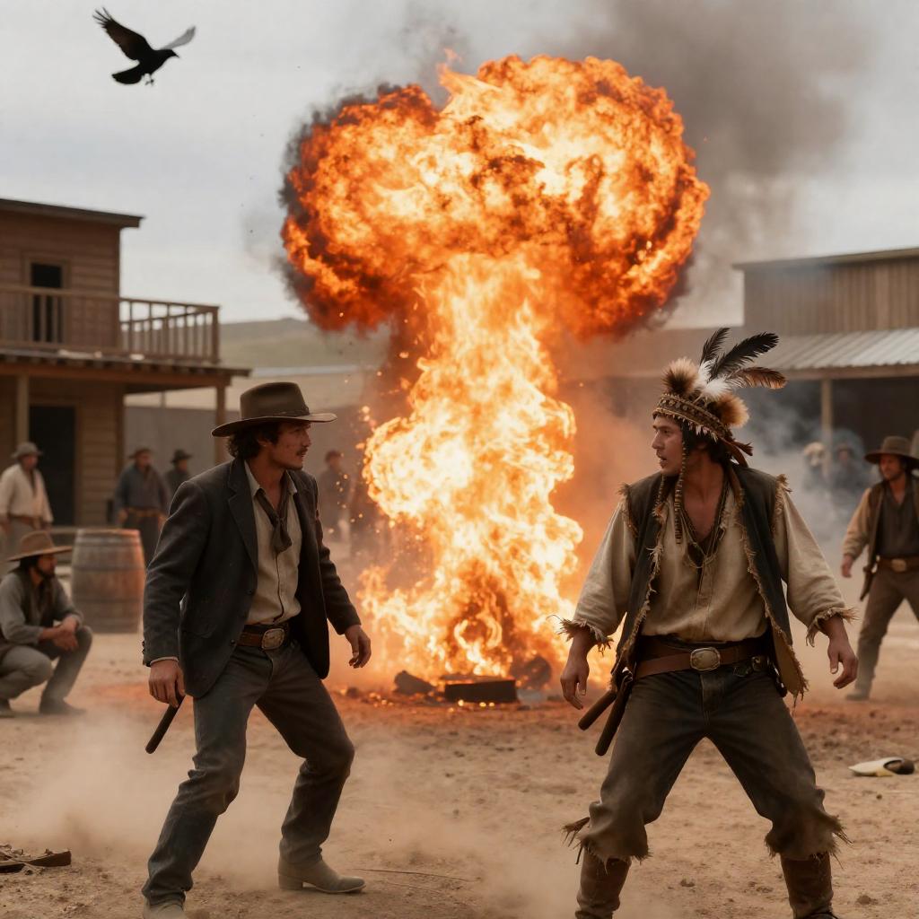 Photograph of a chaotic Western scene. Front: two men, one in dark suit with hat, one in tattered outfit with feathered headgear. Center: large explosion, bright orange flames. Background: wooden buildings, barrels, crouched people, black birds in sky. Intense expressions, dust, smoke. Multiple figures, dynamic poses, Western setting.