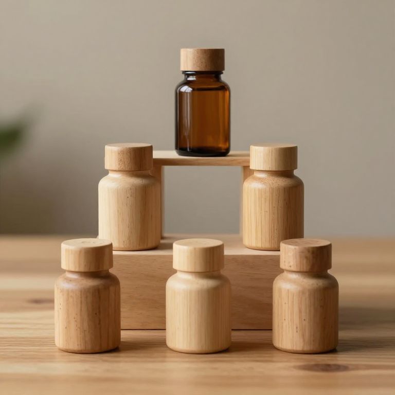 Photograph of five wooden medicine bottles with natural light brown wood finishes and matching wooden caps, arranged on a wooden surface. The largest bottle is centrally placed on a small wooden stand, flanked by two smaller bottles at the front and one on each side at the back. The background is a soft, out-of-focus gray wall, and a blurred green plant is visible in the left corner. The image emphasizes natural textures and warm wooden tones.