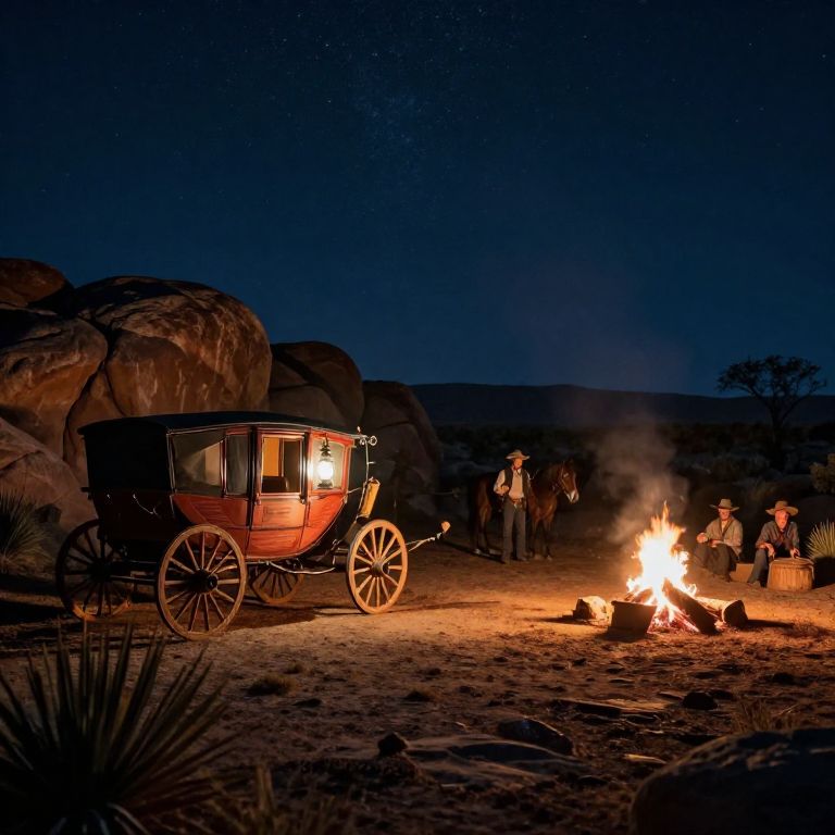 A nighttime scene of a stagecoach illuminated by lantern light, setting camp near a campfire, cowboy figures resting and tending horses, starry sky overhead, richly textured environment with rocks and desert plants, moody and atmospheric.