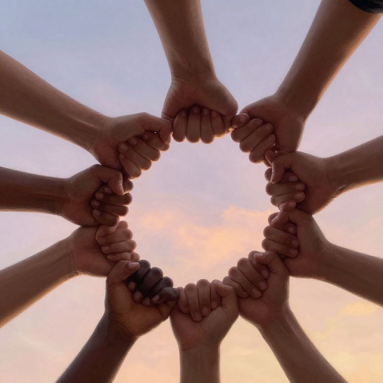 Intertwining hands of diverse people forming a circle of unity against a pastel sunset background, symbolic representation of connection, warmth, and community, soft painterly style with expressive brushstrokes and gentle light.