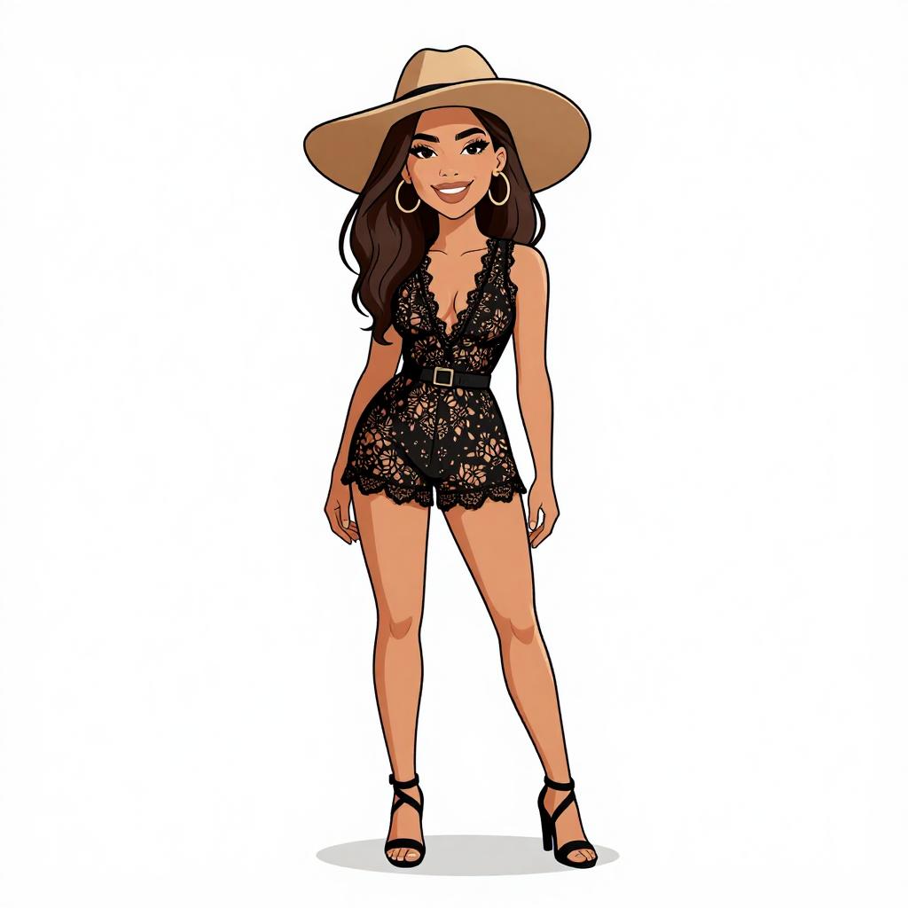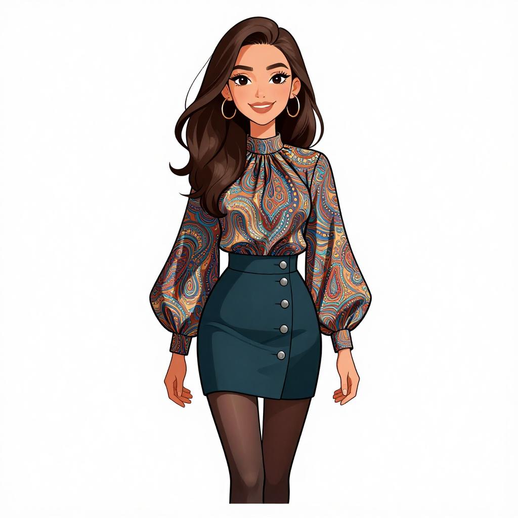 Woman with pretty face and pretty hair. smiling Woman, boho-chic, patterned mini dress with warm color palette, high neckline, long sleeves, cinched waist, flared skirt, faux fur black coat, floppy wide-brimmed hat, knee-high leather boots, plain white background. --sref 1467