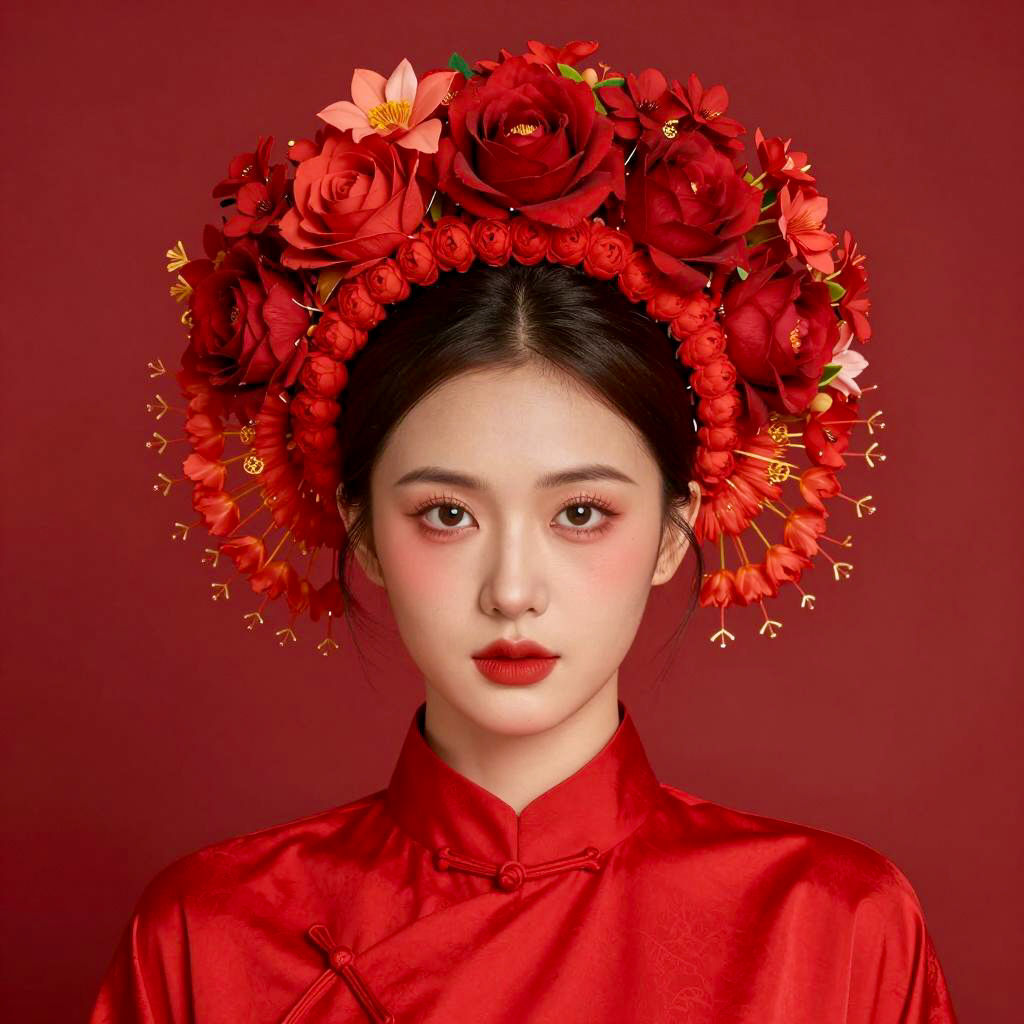 Asian woman with fair skin, red makeup, and full red lips. Wearing colorful floral headdress with fruits, flowers, and beads. Vibrant pink and orange traditional dress with intricate patterns. Large, colorful, floral background. Looking forward, neutral expression. Bright, vivid colors. Upper body only. Close-up. Digital illustration.