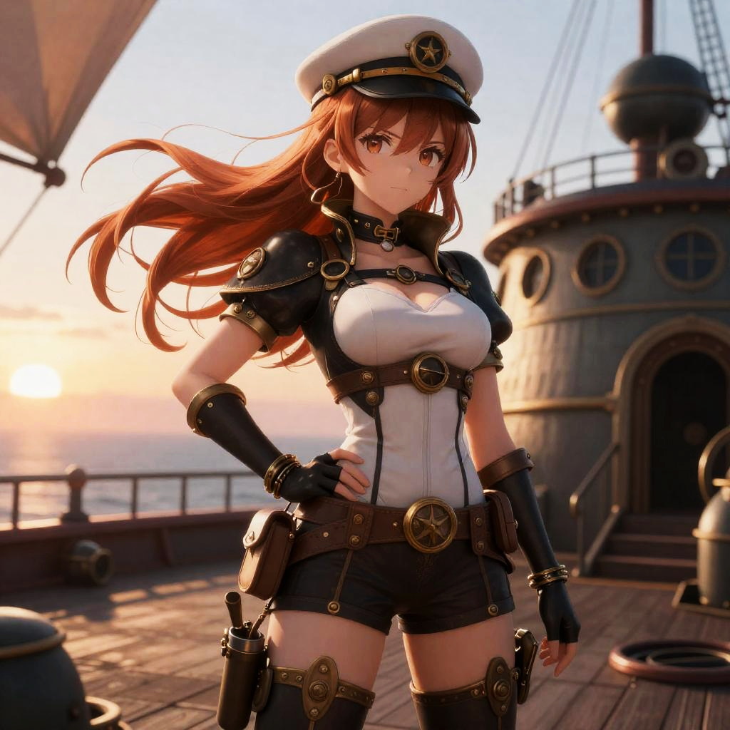 Ecchi art of steampunk airship captain standing confidently in a wind-swept airship deck at sunset, her copper hair flowing in the wind, intense gaze, high-detail anime rendering