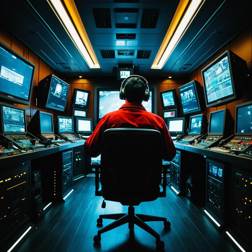 A man sitting on a chair with things attached to his head, screens and monitors in front of him playing videos, ship interior, narrow hallway, scifi colors, dramatic lighting, dark, spotlight, surreal, by rutkowski, fuji choko, hoang lap
