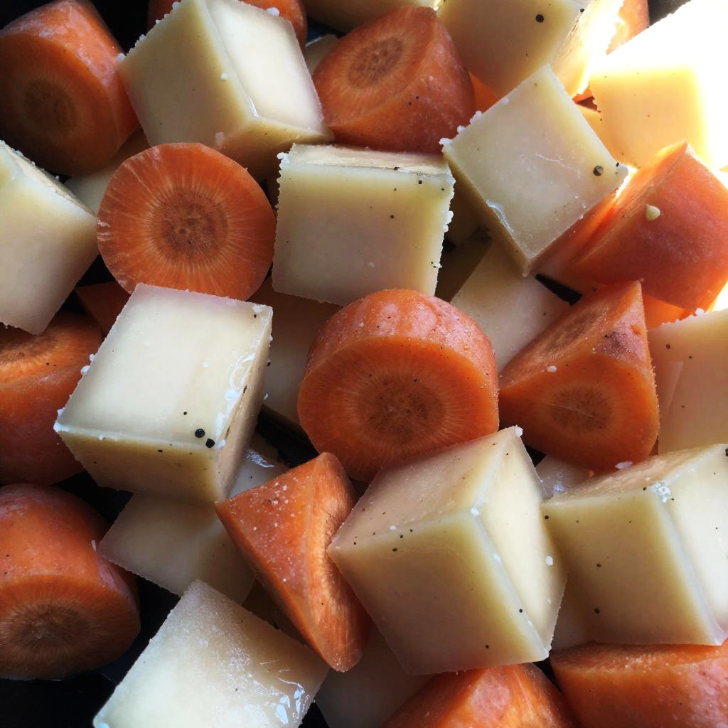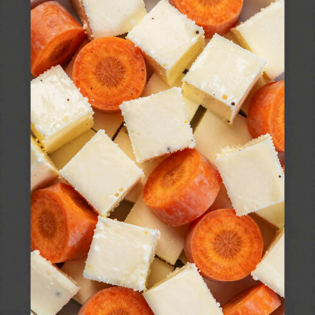 Close-up photo of a mixed cheese and carrot salad. The image shows chunks of pale yellow cheese with small black pepper specks, interspersed with bright orange carrot cubes. The cheese has a slightly crumbly texture, while the carrots are firm and juicy. The lighting creates a bright spot in the upper right corner, highlighting the vibrant colors and textures of the ingredients.