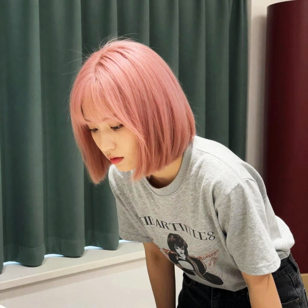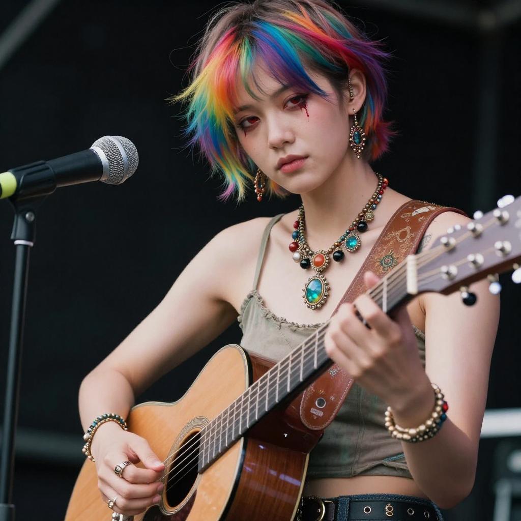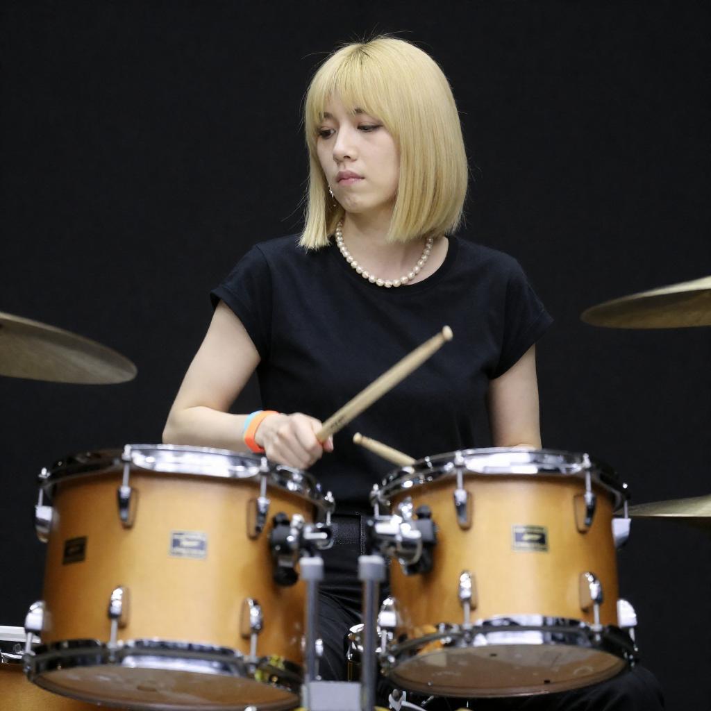 Photograph of a blonde woman with short, straight hair, wearing a black shirt, pearl necklace, and colorful wristbands, playing a yellow drum set. She has a focused expression. Microphone and drum sticks visible. Dark background. One person.