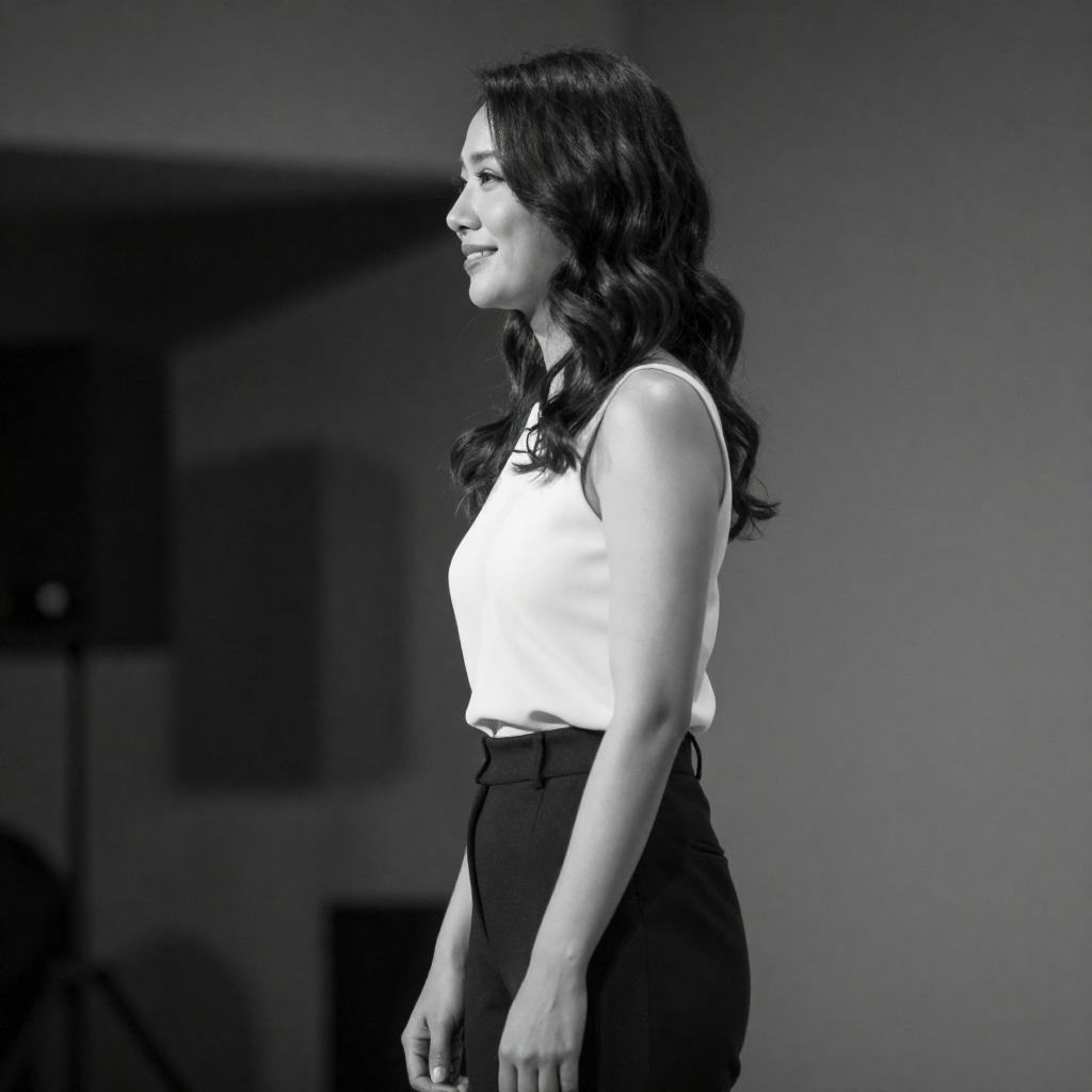 Photograph of a TV game show set. Central figure, a woman in a beige outfit, stands on a hexagonal stage. Four red and white "Blake" chairs are in front. Background includes bright lights, musical instruments, and stage lights.