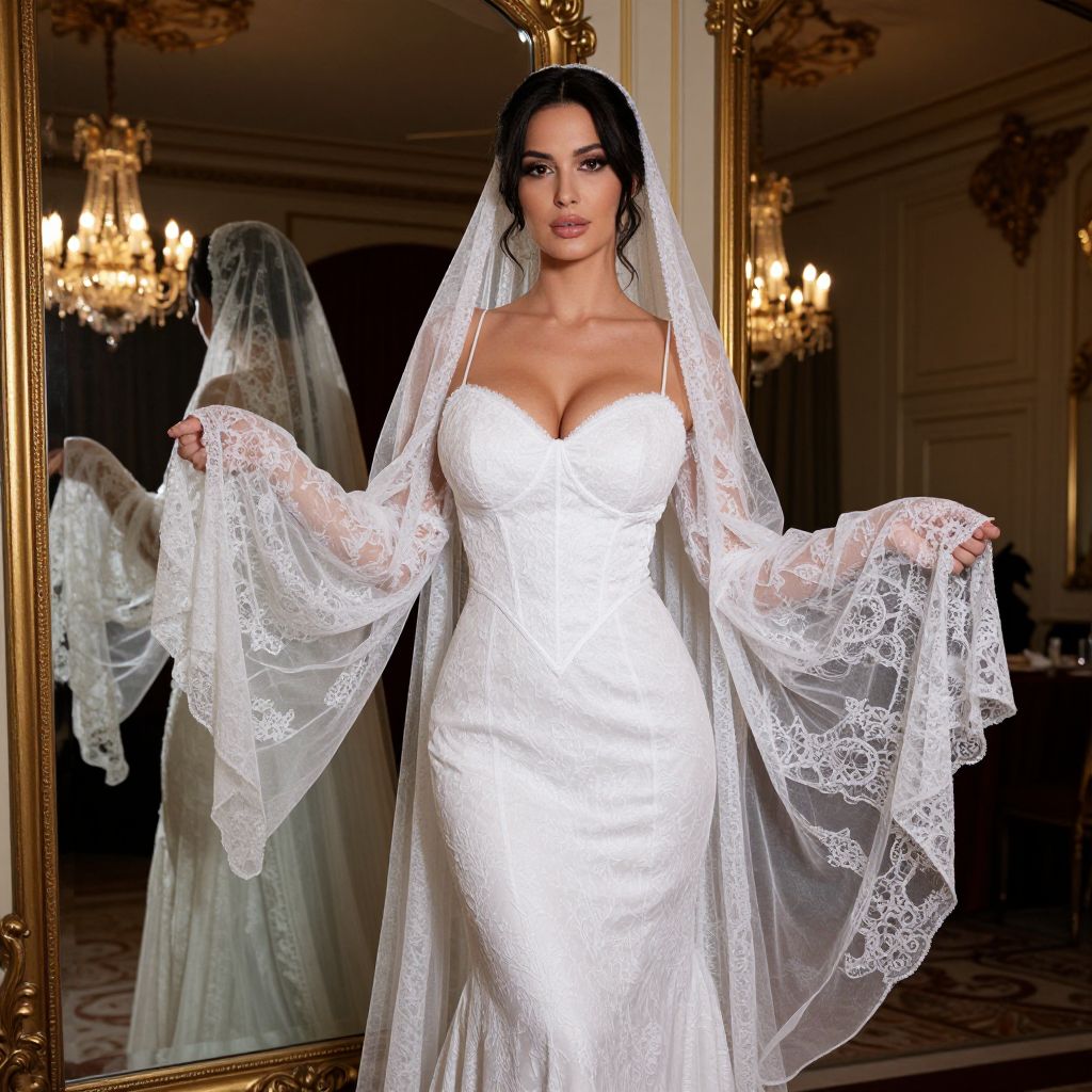 Photograph of a beautiful woman with long dark hair in a white, strapless, lace-embellished wedding dress with a fitted bodice and flowing skirt. She wears a long, sheer lace veil that she holds out to her sides. She stands in an ornate room with gold-accented mirrors and a chandelier in the background. Her makeup is glamorous, with dark eyeliner and red lipstick. The room has elegant, classical decor with patterned floors and gold trim. The lighting is warm, highlighting her figure and the intricate lace details of her dress.