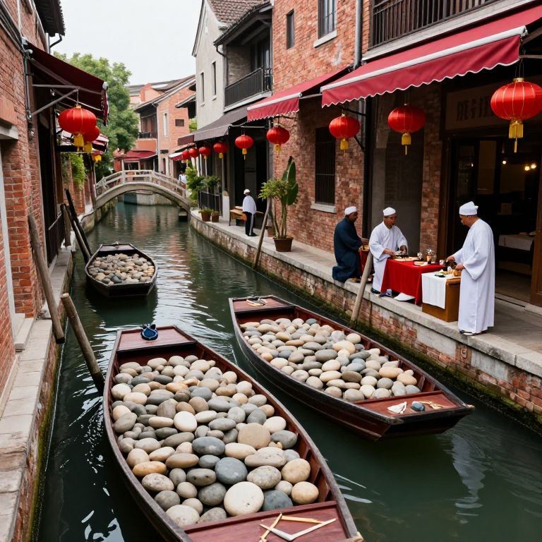 Boats laden with smooth, rounded stones float along a narrow canal, flanked by brick buildings with vibrant red awnings and hanging lanterns, where vendors in traditional robes engage in quiet commerce amidst the tranquil waters.