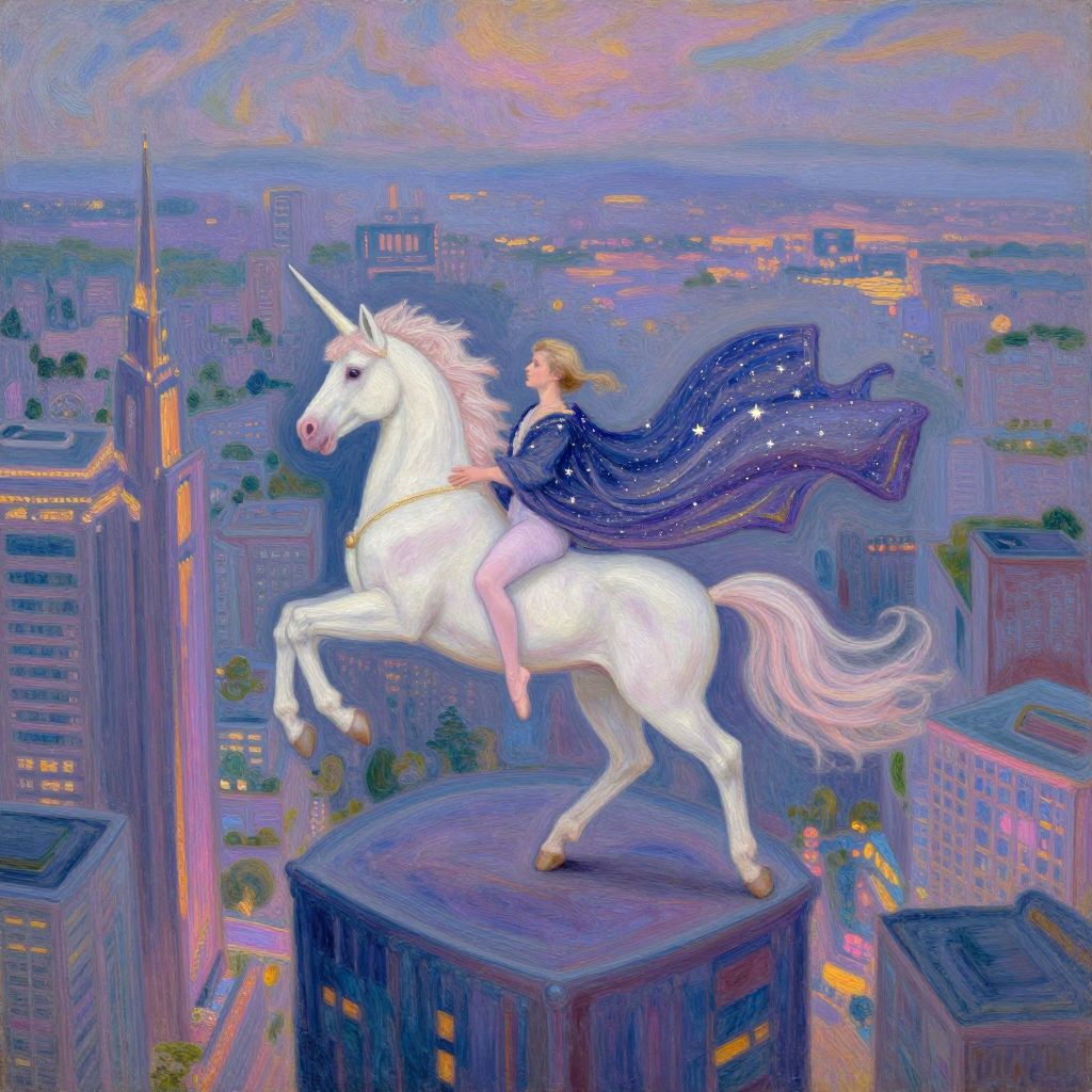 Envision a surrealistic ballet where a regal mythical creature pirouettes through an urban dreamscape at dusk. The scene combines the whimsical essence of surrealist art with impressionist softness, as the unicorn's starry cape weaves through neon-lit structures. From an aerial vantage point, the dance is captured in dreamy hues reminiscent of Monet's landscapes, blending the elegance of ballet with a sense of enchanting mystery. This unique perspective showcases both the serene grace and surreal intrigue created by the harmonious fusion of these artistic styles, evoking an atmosphere that is at once captivating and thought-provoking.