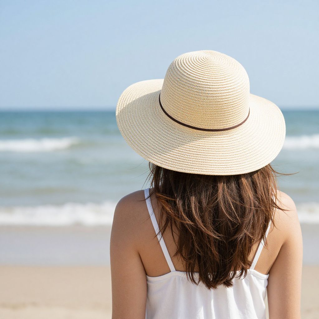 A woman wearing a light-colored straw hat and a white sleeveless top stands on a sandy beach, facing the ocean. The background features calm waves and a clear blue sky, creating a serene seaside atmosphere.