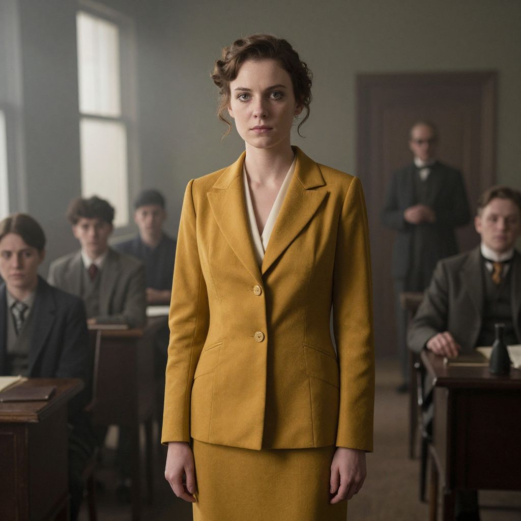In a room suffused with the weight of history and the quiet hum of ambition, a woman in a mustard suit stands as a beacon of resolve, her gaze piercing through the haze of conformity, embodying the unyielding spirit of change amidst the echoes of a bygone era.