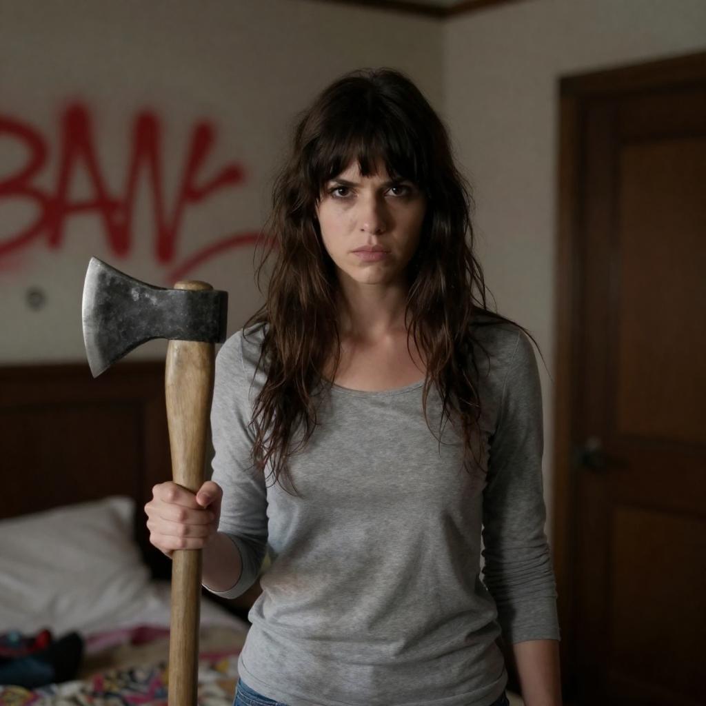 Woman with long brown hair and bangs, wearing a gray long-sleeve shirt, holding an axe, standing in a dimly lit room with red graffiti on the wall. Dark wooden headboard in the background. Intense expression. Bed with patterned blankets partially visible. Door on the right.
