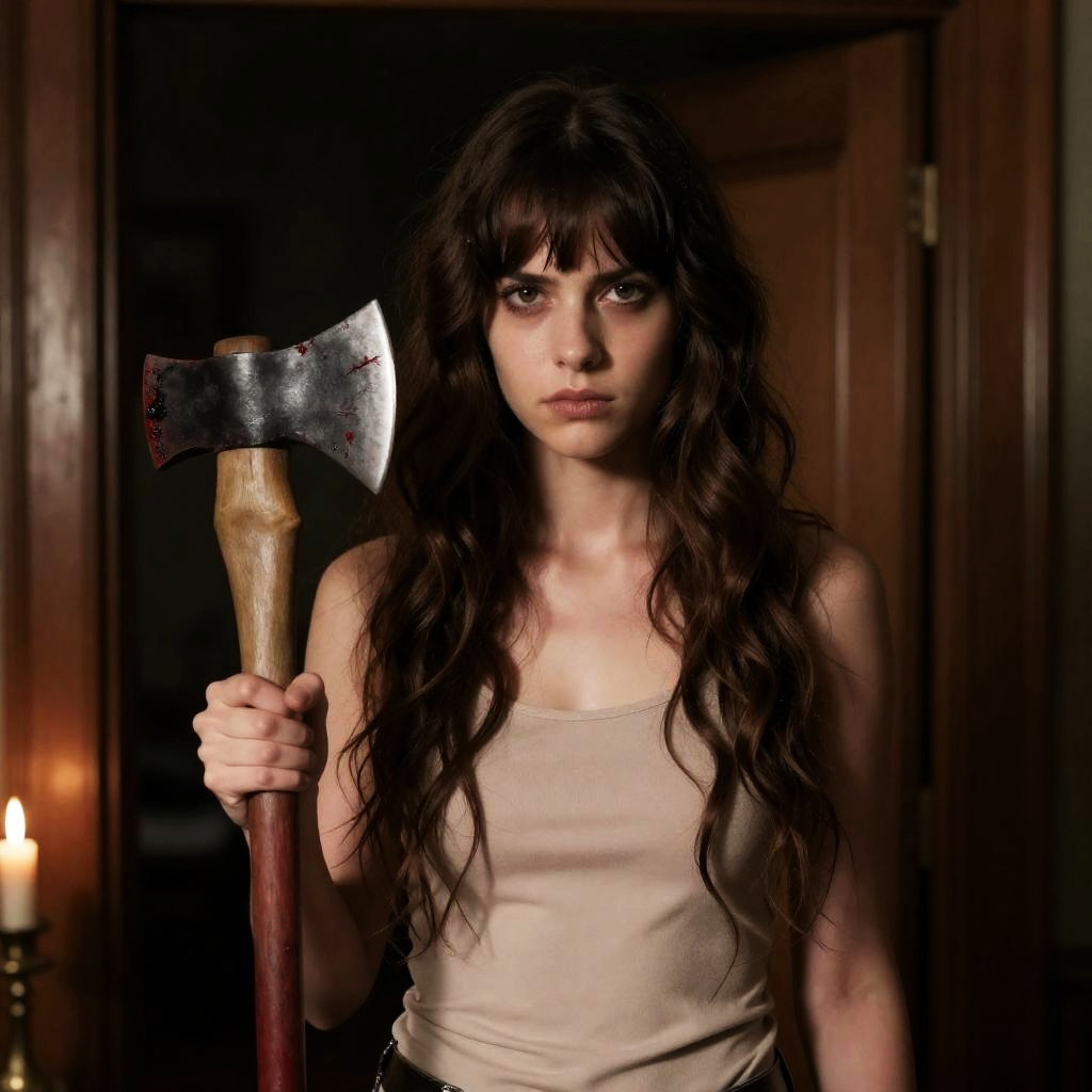 Intense Woman with Axe in Dim Room