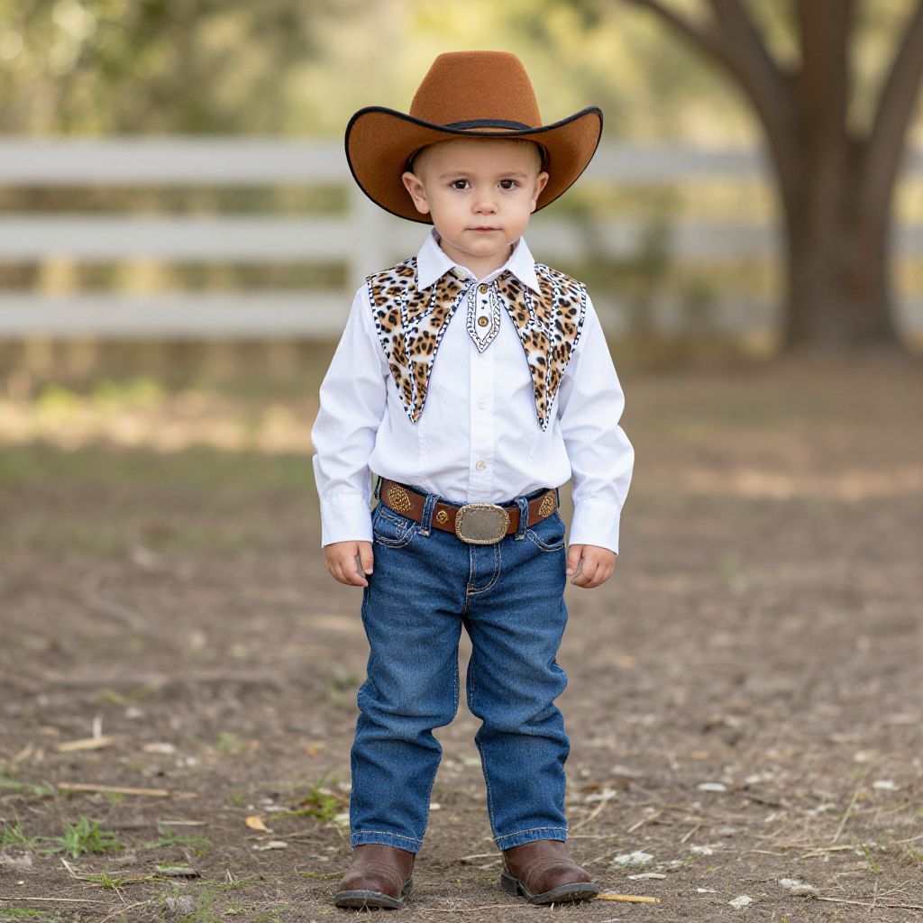 Photograph of a young boy in a brown cowboy hat, white shirt, leopard print vest, blue jeans, and brown boots, standing on a dirt