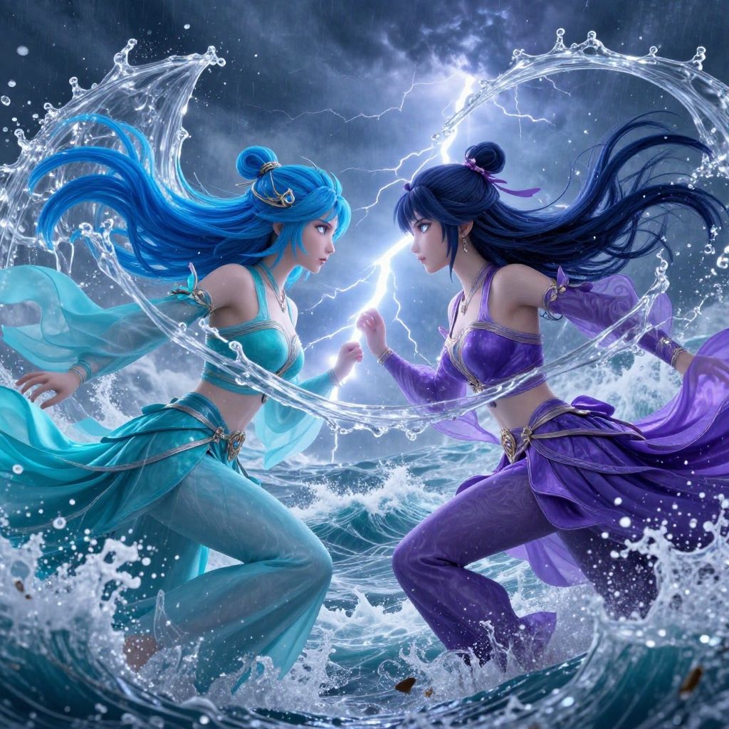Digital artwork of two magical, water-wielding women in vibrant blue and purple outfits, clashing with lightning amidst splashing waves, creating an electrifying