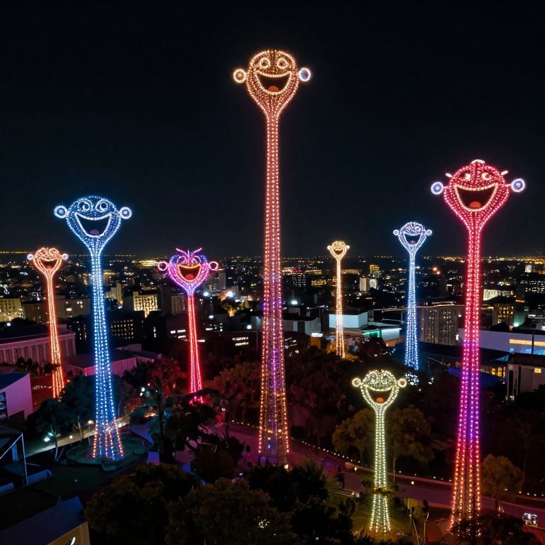 Photograph of a night cityscape featuring tall, colorful, neon-lit sculptures resembling stylized human figures with smiling faces. The sculptures are adorned with bright red, blue, yellow, and white lights, standing against a dark, starless sky. The city below is illuminated with scattered lights from buildings and streets. The sculptures are positioned at varying heights, with some taller than others, creating a vibrant, festive atmosphere. The background shows a distant city skyline with numerous lit windows. The foreground includes trees partially obscuring the view of the sculptures.