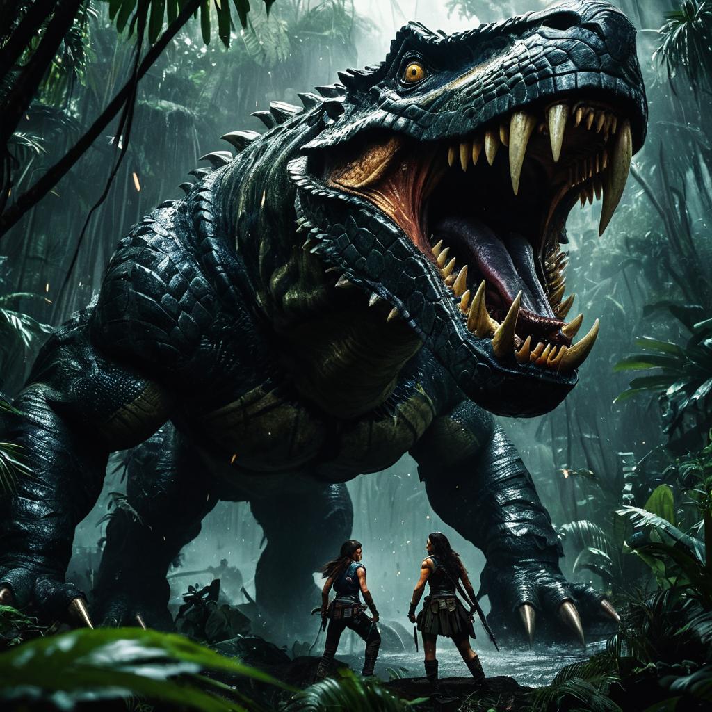 Very dark focused flash photo, amazing quality, masterpiece, best quality, hyper detailed, ultra detailed, UHD, perfect anatomy, portrait, dof, hyper-realism, majestic, awesome, inspiring. Capture the thrilling showdown between the beautiful female Savage huntress and the colossal jungle boss Floating leviathan in an epic battle amidst the jungle. Embrace the action and chaos as these formidable forces clash. Cinematic composition, soft shadows, national geographic style, extremely detailed, dark, chiaroscuro, low-key, Bosstyle.