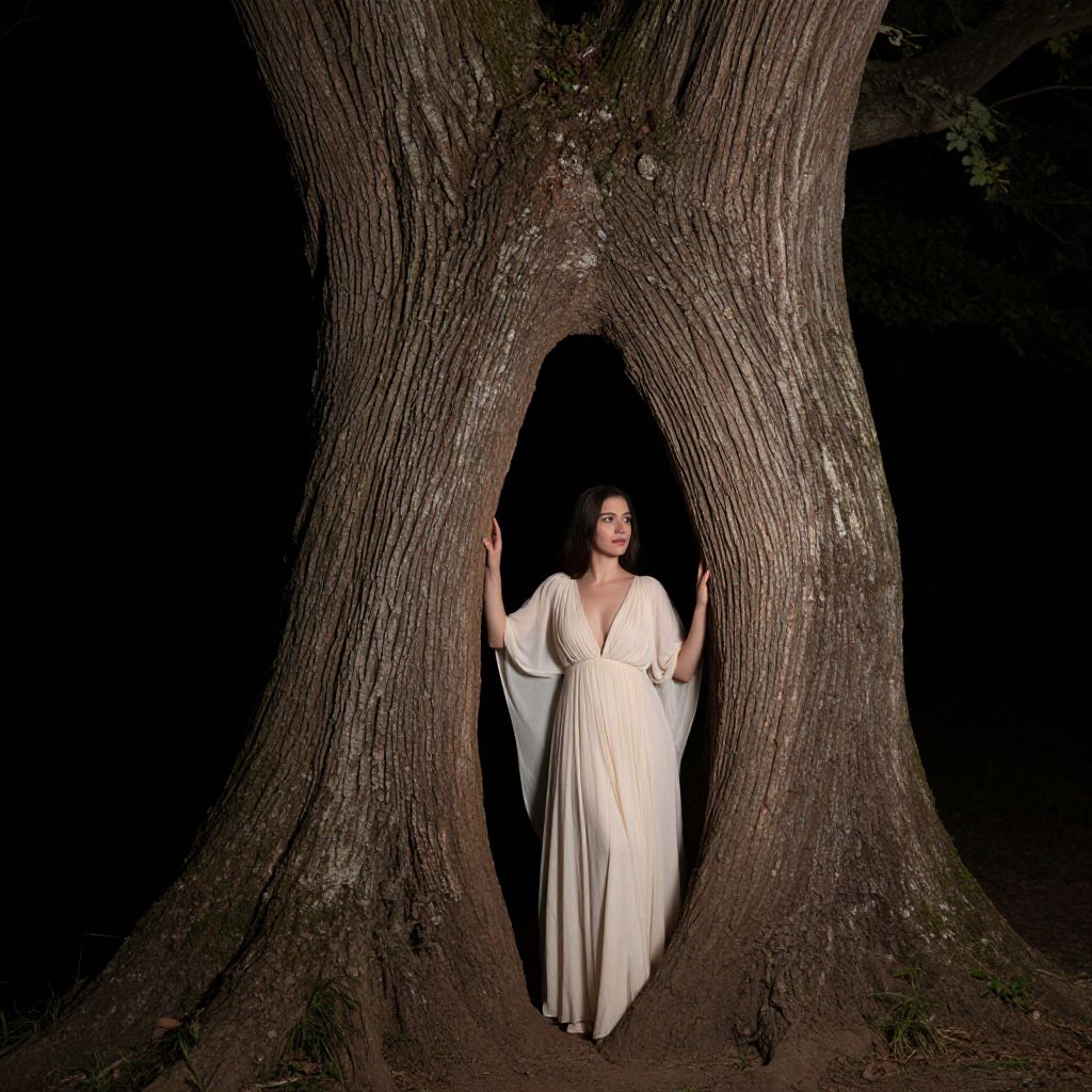 Photograph of a woman with fair skin and dark brown hair, standing in the center of a large, hollow tree at night. She wears a flowing, white, V-neck robe that reaches the ground, with wide sleeves. Her hands are raised, touching the tree trunk on either side of the hollow. The tree's rough, textured bark contrasts with her smooth, white garment. The background is completely black, emphasizing the woman and the tree. The lighting highlights the woman and the tree's hollow, casting shadows that enhance the mysterious, ethereal atmosphere of the scene.