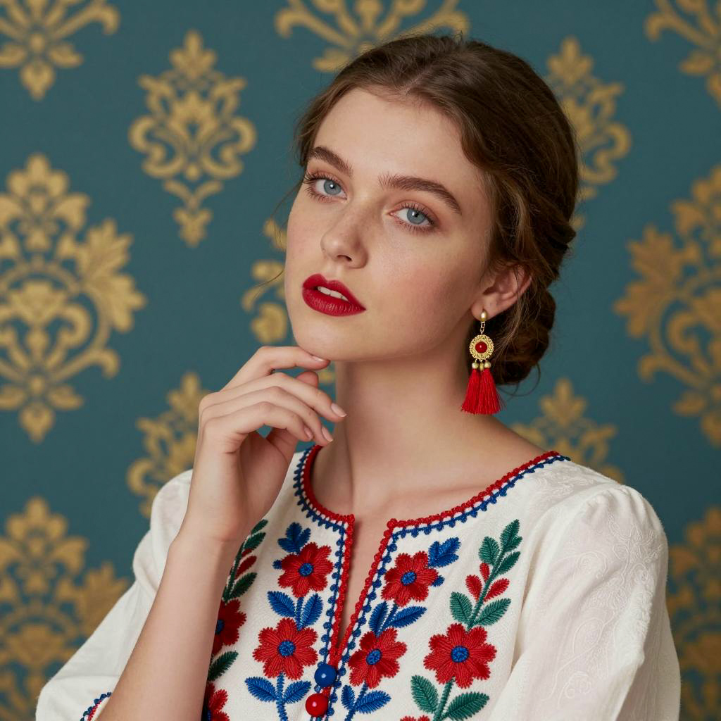 Young woman with fair skin and blue eyes, wearing a white embroidered blouse with red and blue floral patterns, gold and red earrings with tassels. She has red lipstick, dark brown hair in a low bun, and gazes upward with her hand near her chin. Teal and gold patterned background. Photographic image.
