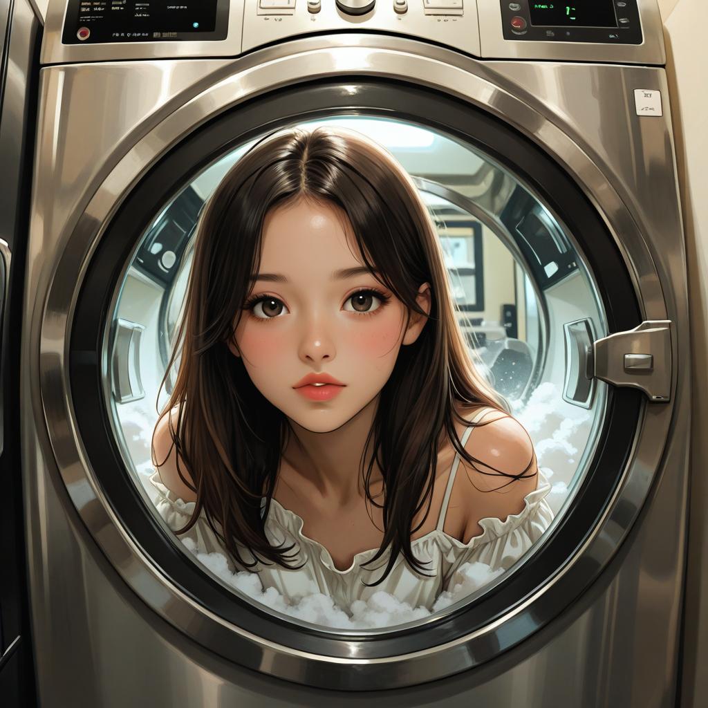 Digital art of a young Asian woman with long brown hair and pink lips, looking through a stainless steel washing machine door. She wears a white, r
