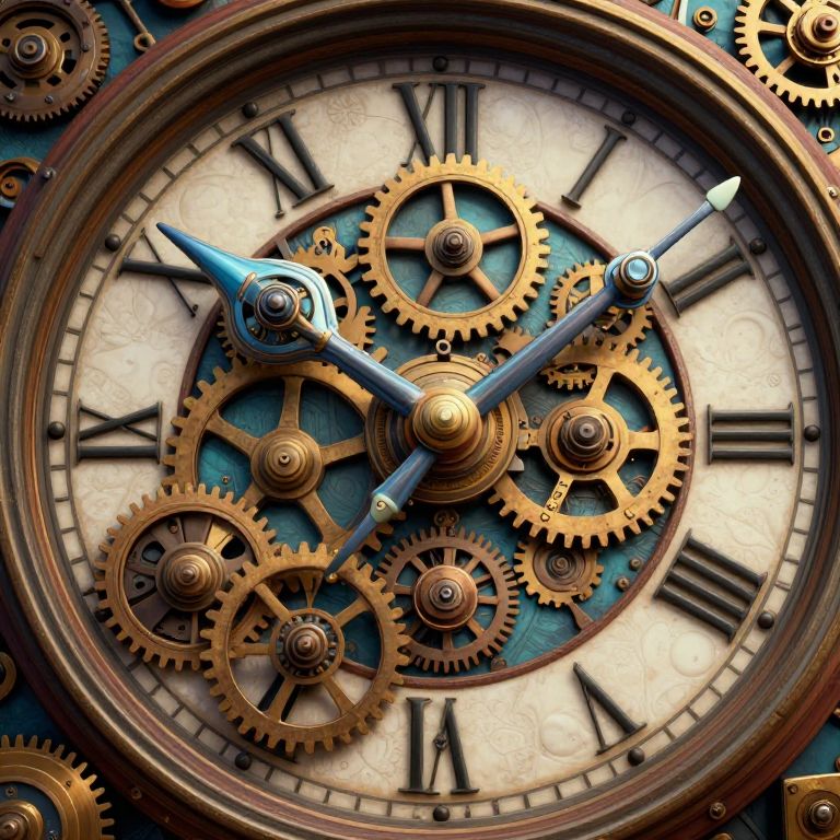 A whimsical digital artwork depicting an intricate close-up view of a steampunk-inspired clock face, composed of intertwining gears and mechanical components. The clock hands are replaced with sleek, futuristic instruments reminiscent of an airship's propeller, suggesting movement and adventure. Vivid, otherworldly colors and detailed textures evoke a nostalgic appreciation for classic machinery while also hinting at the excitement of the future, inviting viewers to immerse themselves in this fantastical blend of past and present.
