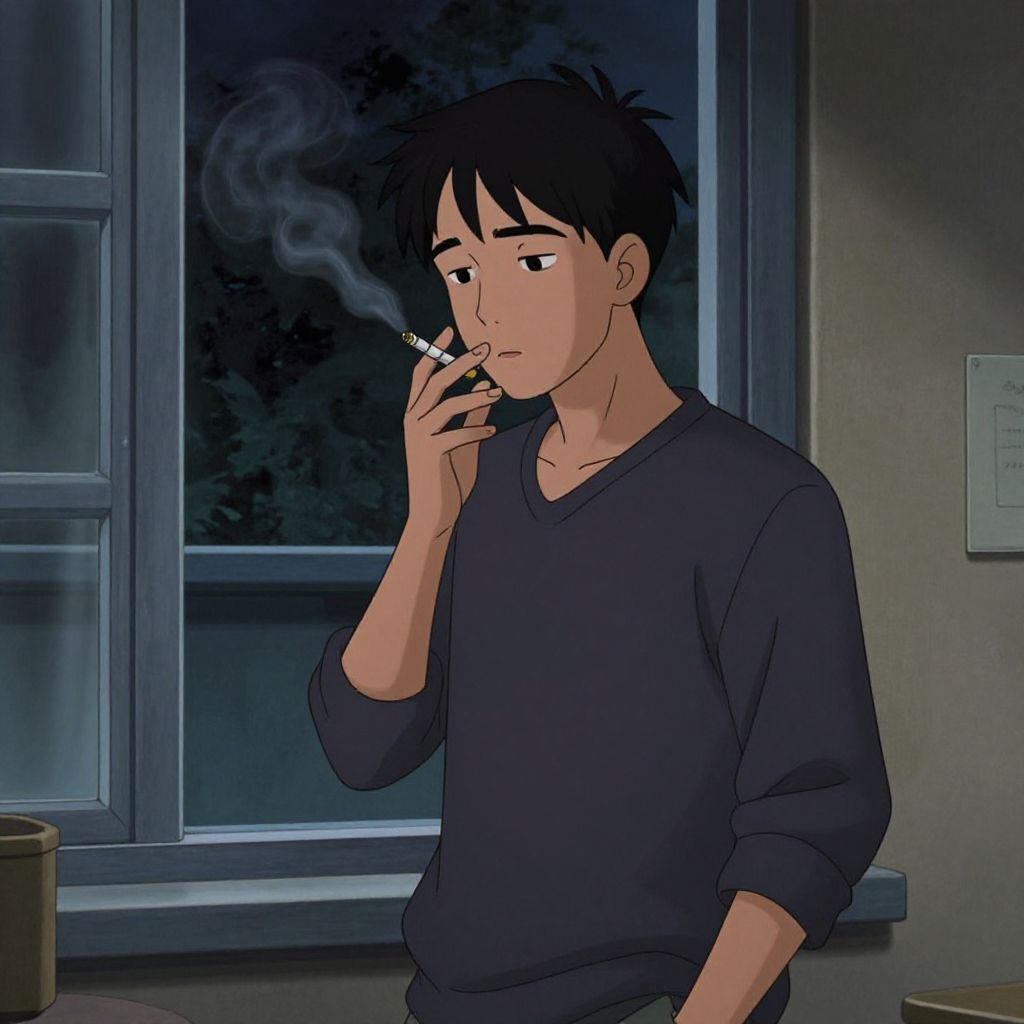 "Animated close shot of a young man standing by his window in apartment and smoking cigarette, night, roger deakins, cinematic, soft lens filter, aesthetic,"