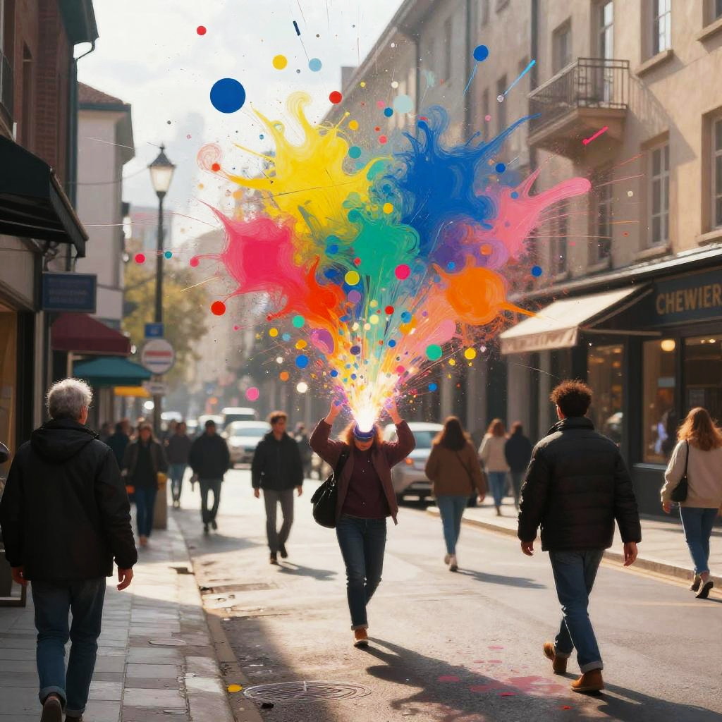 AI art using image transformation turning an ordinary street scene into an energetic abstract explosion of colors, lights, and shapes, incorporating AI-driven style transfer techniques to achieve dynamic brush strokes and vivid contrasts, contemporary digital art style.