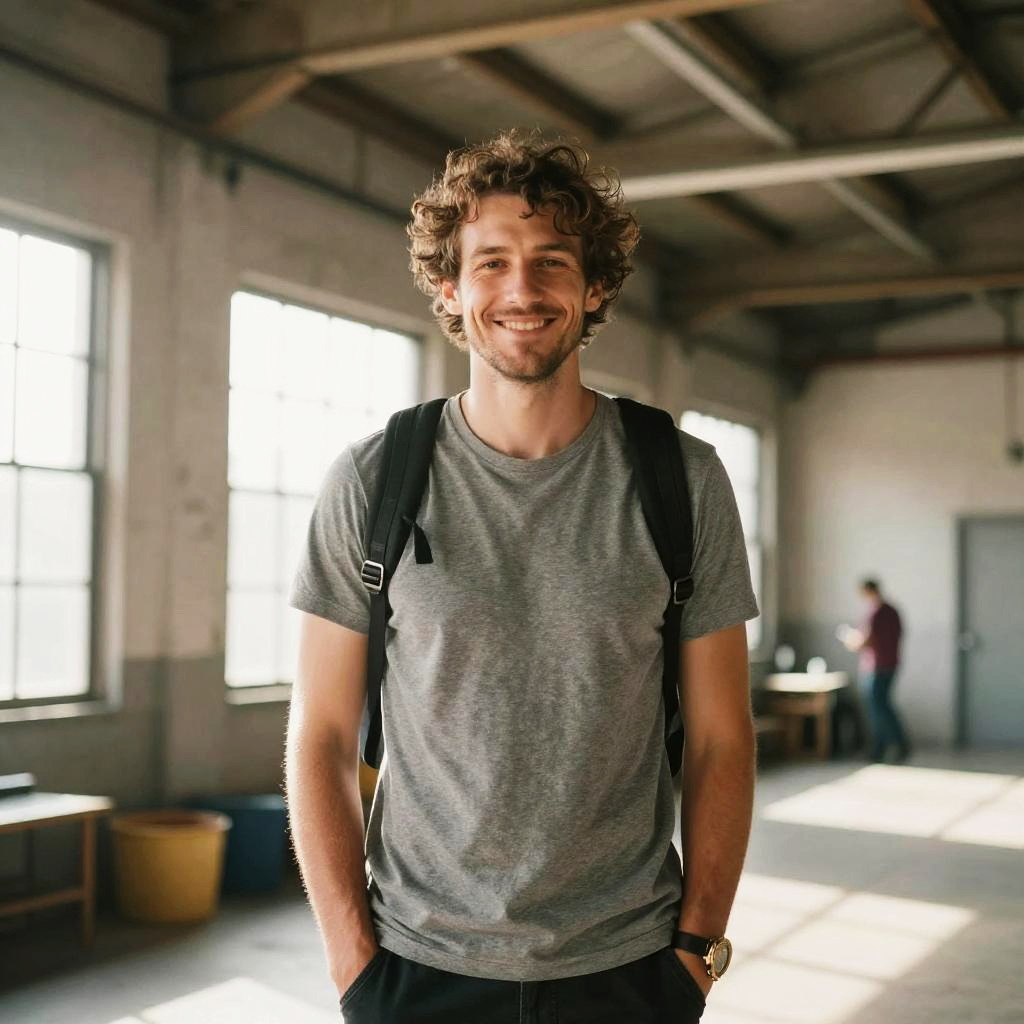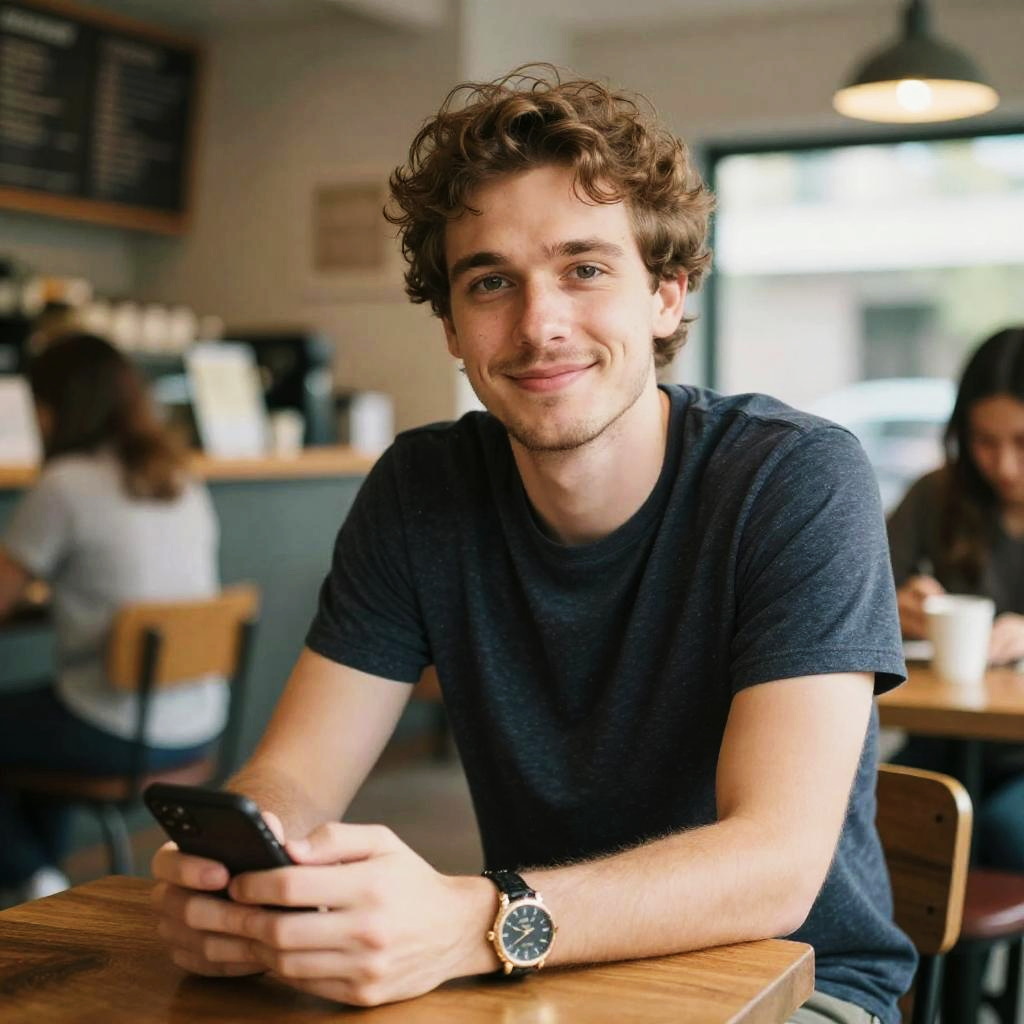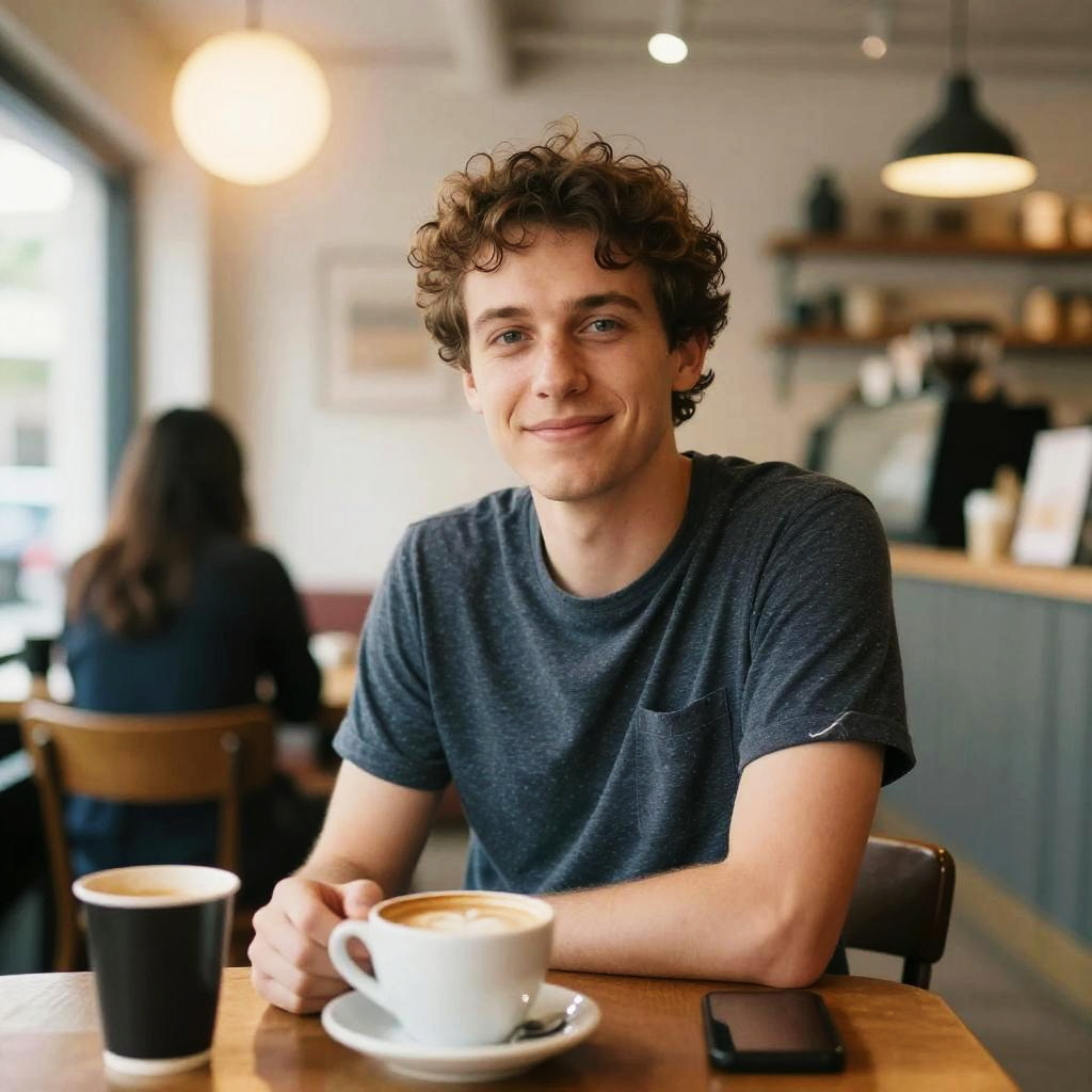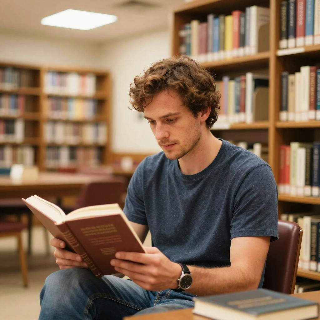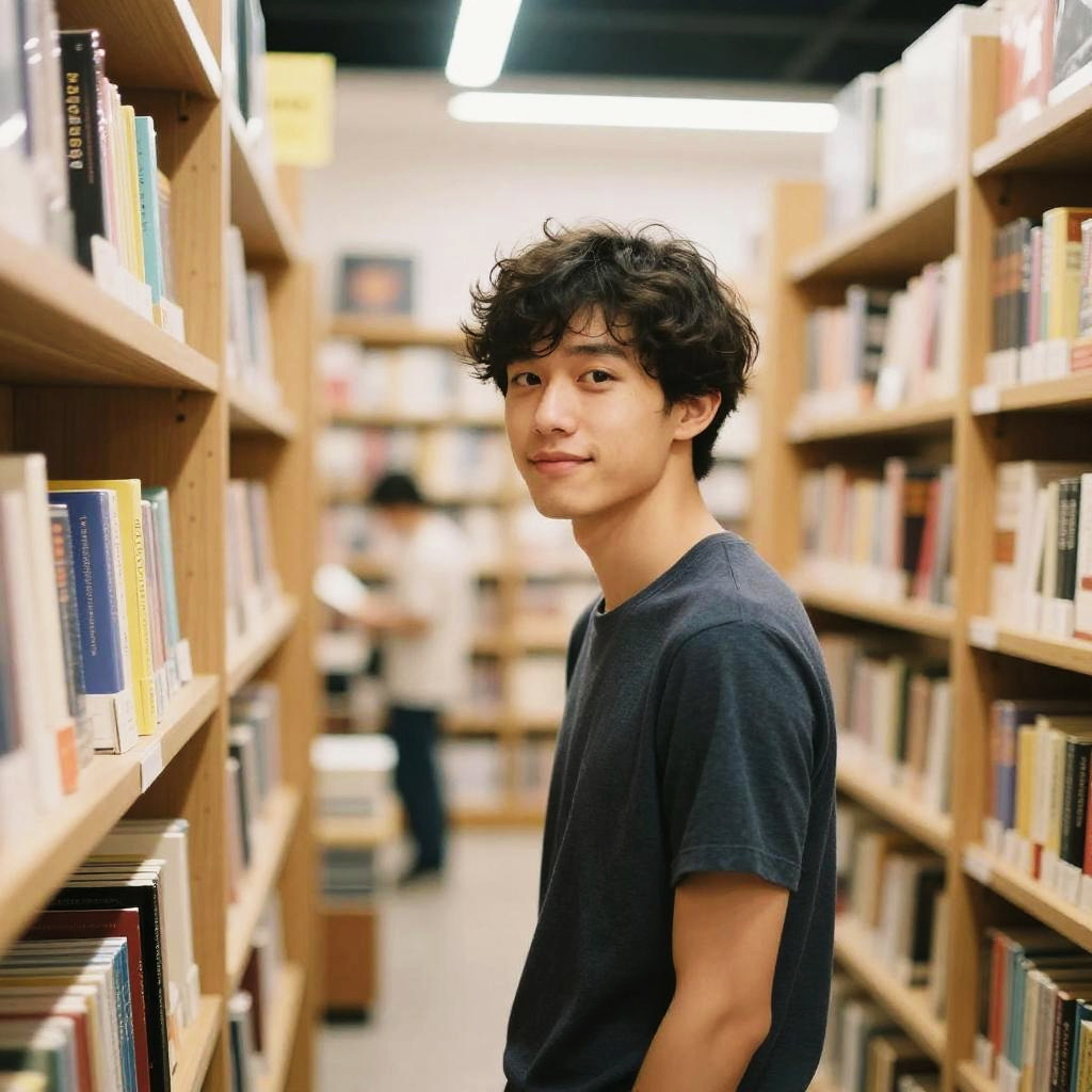 A candid lifestyle portrait of a man captured in a bookstore. The image features soft focus, warm tones, and natural lighting. Vibrant colors, subtle lens flare, and a dynamic depth create an airy atmosphere. The composition is casual and inviting, with lifestyle elements enhancing the sense of authenticity and warmth.
