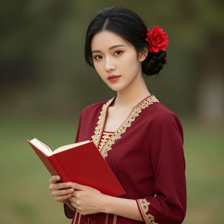 Female wearing a maroon dress with gold embroidery and a red flower in her hair. She is holding a red book in her hands and looking at the camera.