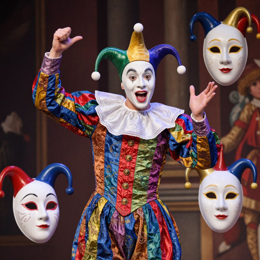 Vibrant jester in colorful, ornate costume with white ruffled collar, gold-trimmed hat, and white masks floating around, performing