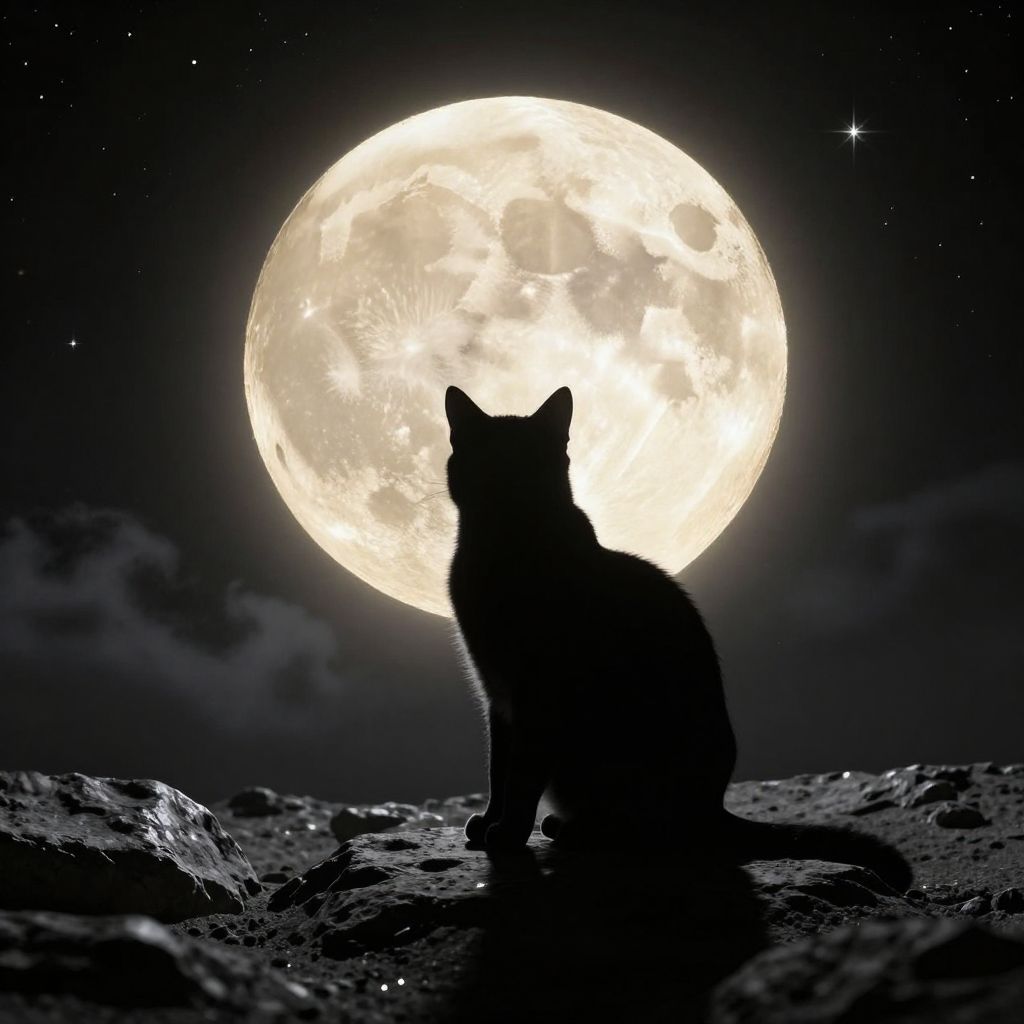 Cat sitting on the moon, silhouette against a giant glowing full moon, dark space with sparkling stars, subtle clouds drifting below, tranquil and magical ambiance, high contrast with soft light reflections on lunar rocks