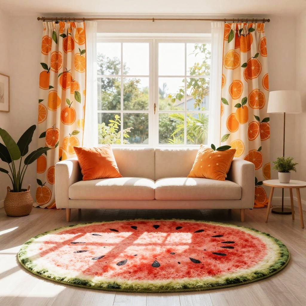 Fruit themed room designed with giant watermelon slice rugs, citrus fruit patterned curtains, fruit-shaped cushions on a minimalist sofa, sunlight streaming through large windows, playful and modern interior