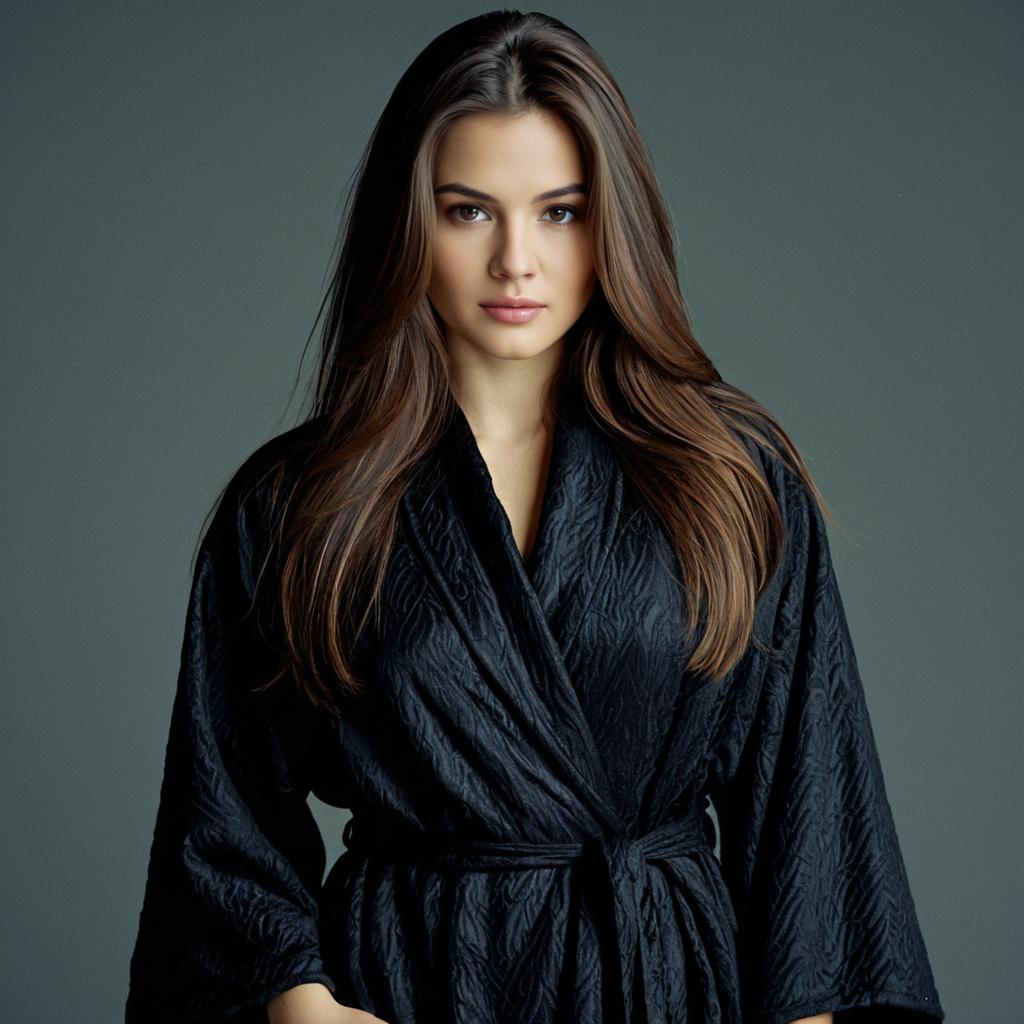 Black dressing gown woman,solo, 1girl, realistic, long hair, robe, brown hair, looking at viewer, closed mouth, standing, long sleeves, brown eyes