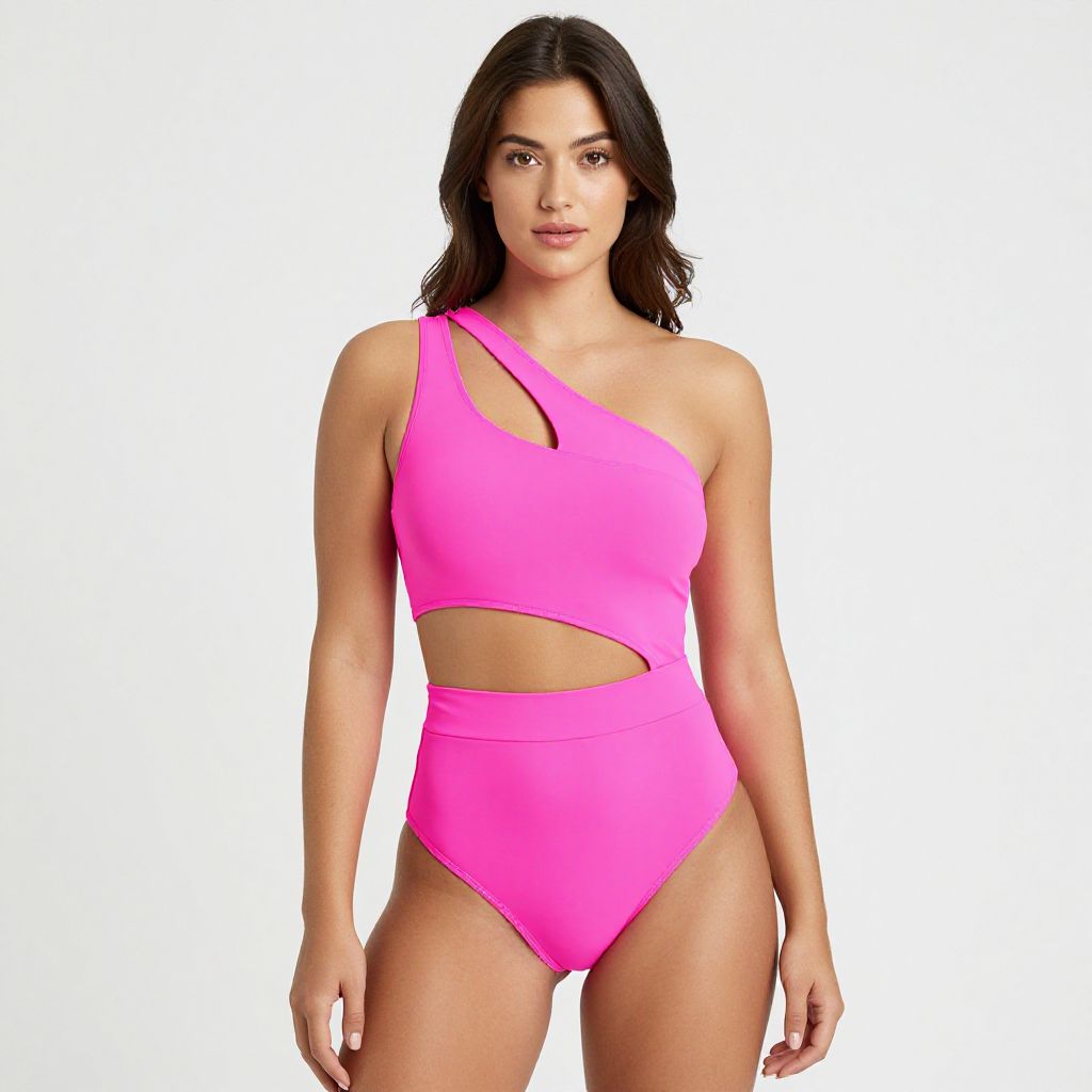 "Woman, contemporary swimwear, asymmetrical two-piece bikini in bright pink, one-shoulder strap, cut-out design on top and bottom, high-cut leg, plain background. Sexy. Pretty face and beаutiful eyes. Big breasts."