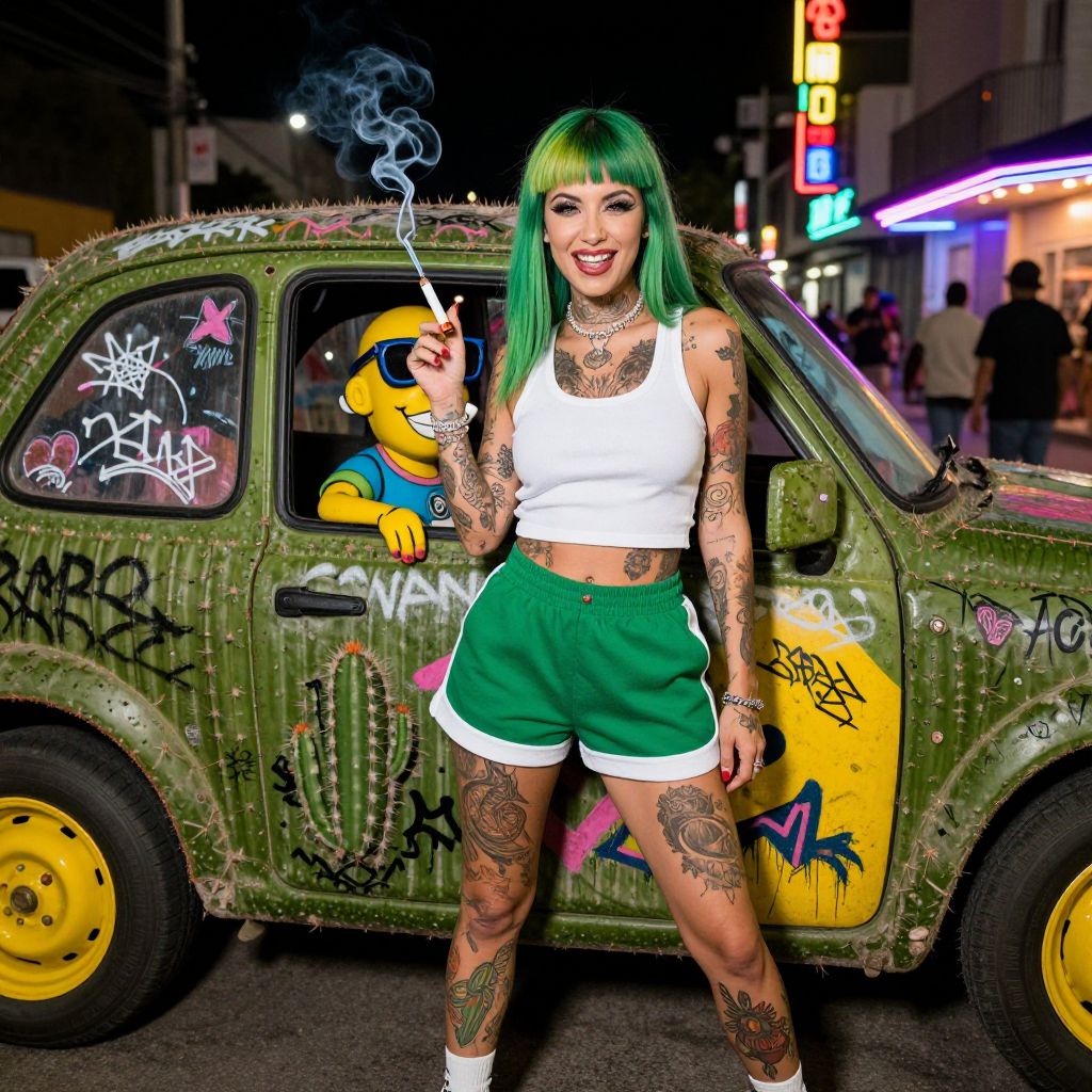 In this vibrant and dynamic scene, a tattooed woman with striking green hair and a confident wink stands confidently in front of a car made of cactuses, which is adorned with graffiti and street art. The car, painted in shades of green and yellow, features a large, open window displaying a cartoonish character smoking a marijuaanna joint. The woman, dressed in a white tank top and green shorts, exudes an urban, hip-hop vibe, with her tattoos visible on her arms and chest. The background is a bustling street scene, illuminated by the glow of neon lights, suggesting a night-time setting. The overall composition is rich with texture and color, creating a lively and engaging atmosphere.