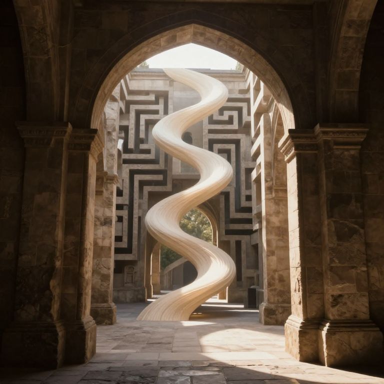 Through the labyrinthine arches of an eternal stone gate, a radiant light beckons, weaving a Möbius tapestry of infinite possibility, where time loops endlessly and the soul contemplates the paradox of choice and destiny.