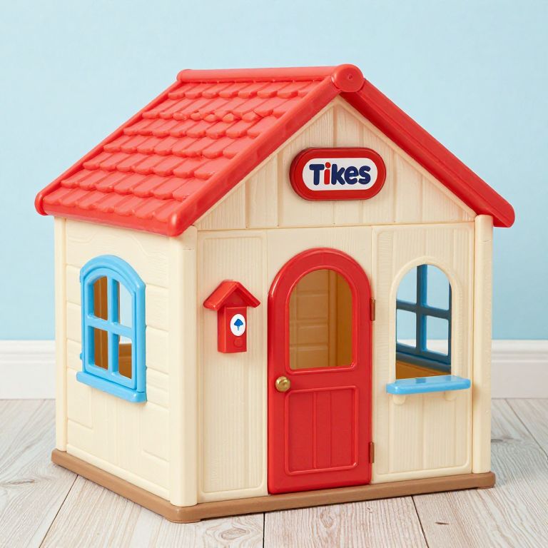 Photograph of a wooden toy house with red roof, red door, blue window frames, and "Tikes" sign on light wood floor.