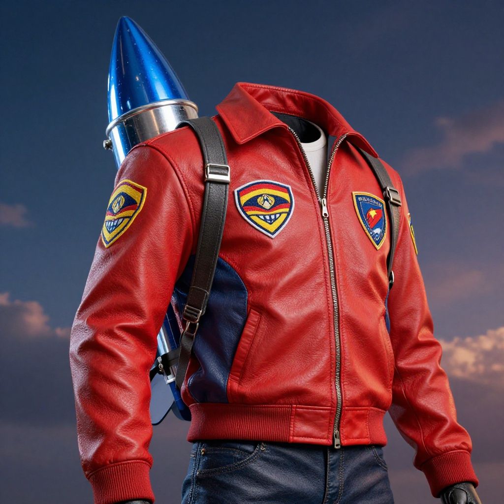 Disney Rocketeer costume in a vibrant vintage style, detailed leather jacket with bold insignia, classic rocket pack with shining metallic finish, set against a dramatic sky backdrop with dynamic lighting and realistic textures